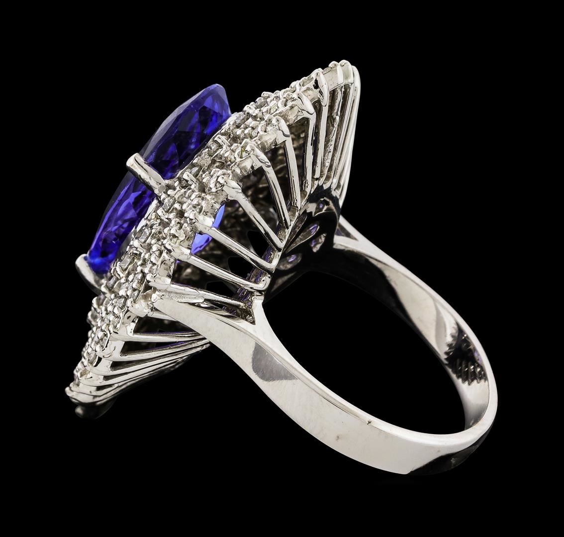 One electronically tested 14KT white gold lady's cast fashion ring with a triple basket halo with a bright polish finish. The featured lady's ring has a shank measuring 3.26 millimeters wide. Identified with markings of 'K14'. Condition is new, good workmanship. Containing: One prong set pear modified brilliant cut natural tanzanite, measuring 16.90 x 10.93 x 6.92mm, (depth est.) approximate weight of 8.48ct., clarity is eye clean, medium, moderately strong, violetish blue color, (GIA vB 5/4), cut is very good. Transmitting light with no distortion, transparent. Colored gemstones are presumed to have been subjected to commonly used enhancement processes. Graded loose prior to setting in the GIA Laboratory, Report #1172847783. Nineteen prong set round brilliant cut diamonds, measuring 2.00 - 1.90 x 1.21mm (depth est.) approximate total weight of 19 Stones = 0.53ct. Graded in the setting. Clarity SI-1 to SI-2. Color: H - I Cut Good Thirty-Two prong set round brilliant cut diamonds, measuring 1.70 - 1.60 x 1.02mm (depth est.) approximate total weight of 32 Stones = 0.54ct. Graded in the setting. Clarity SI-1 to SI-2. Color: H - I Cut Good Sixty-Four prong set round brilliant cut diamonds, measuring 1.25 - 1.15 x 0.72mm (depth est.) approximate total weight of 64 Stones = 0.40ct. Graded in the setting. Clarity SI-1 to I-1. Color: H - I Cut Good. Total Weight of Colored Stones 8.48ct.. Total Weight of Diamonds 1.47ct.. Total Weight of Ring 12.90gm. GAS Appraised at $16,550.00.