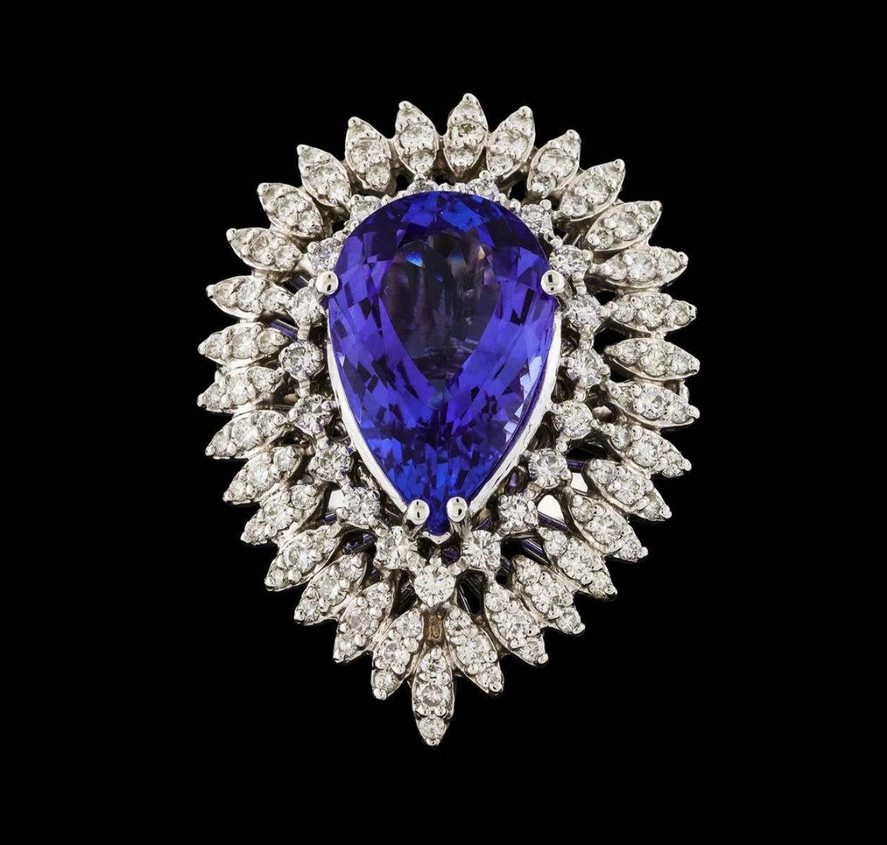 One electronically tested 14KT white gold lady's cast fashion ring with a triple basket halo with a bright polish finish. The featured lady's ring has a shank measuring 3.26 millimeters wide. Identified with markings of 'K14'. Condition is new, good workmanship. Containing: One prong set pear modified brilliant cut natural tanzanite, measuring 16.90 x 10.93 x 6.92mm, (depth est.) approximate weight of 8.48ct., clarity is eye clean, medium, moderately strong, violetish blue color, (GIA vB 5/4), cut is very good. Transmitting light with no distortion, transparent. Colored gemstones are presumed to have been subjected to commonly used enhancement processes. Graded loose prior to setting in the GIA Laboratory, Report #1172847783. Nineteen prong set round brilliant cut diamonds, measuring 2.00 - 1.90 x 1.21mm (depth est.) approximate total weight of 19 Stones = 0.53ct. Graded in the setting. Clarity SI-1 to SI-2. Color: H - I Cut Good Thirty-Two prong set round brilliant cut diamonds, measuring 1.70 - 1.60 x 1.02mm (depth est.) approximate total weight of 32 Stones = 0.54ct. Graded in the setting. Clarity SI-1 to SI-2. Color: H - I Cut Good Sixty-Four prong set round brilliant cut diamonds, measuring 1.25 - 1.15 x 0.72mm (depth est.) approximate total weight of 64 Stones = 0.40ct. Graded in the setting. Clarity SI-1 to I-1. Color: H - I Cut Good. Total Weight of Colored Stones 8.48ct.. Total Weight of Diamonds 1.47ct.. Total Weight of Ring 12.90gm. GAS Appraised at $16,550.00.