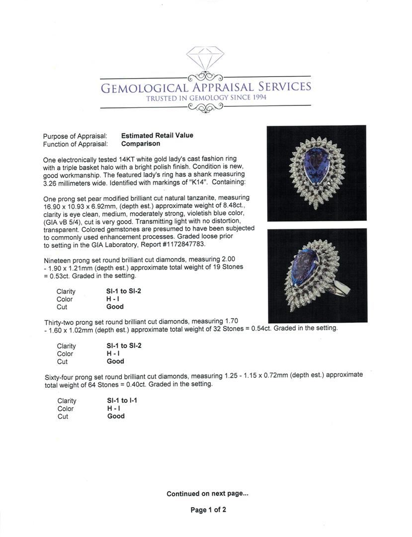 One electronically tested 14KT white gold lady's cast fashion ring with a triple basket halo with a bright polish finish. The featured lady's ring has a shank measuring 3.26 millimeters wide. Identified with markings of 'K14'. Condition is new, good workmanship. Containing: One prong set pear modified brilliant cut natural tanzanite, measuring 16.90 x 10.93 x 6.92mm, (depth est.) approximate weight of 8.48ct., clarity is eye clean, medium, moderately strong, violetish blue color, (GIA vB 5/4), cut is very good. Transmitting light with no distortion, transparent. Colored gemstones are presumed to have been subjected to commonly used enhancement processes. Graded loose prior to setting in the GIA Laboratory, Report #1172847783. Nineteen prong set round brilliant cut diamonds, measuring 2.00 - 1.90 x 1.21mm (depth est.) approximate total weight of 19 Stones = 0.53ct. Graded in the setting. Clarity SI-1 to SI-2. Color: H - I Cut Good Thirty-Two prong set round brilliant cut diamonds, measuring 1.70 - 1.60 x 1.02mm (depth est.) approximate total weight of 32 Stones = 0.54ct. Graded in the setting. Clarity SI-1 to SI-2. Color: H - I Cut Good Sixty-Four prong set round brilliant cut diamonds, measuring 1.25 - 1.15 x 0.72mm (depth est.) approximate total weight of 64 Stones = 0.40ct. Graded in the setting. Clarity SI-1 to I-1. Color: H - I Cut Good. Total Weight of Colored Stones 8.48ct.. Total Weight of Diamonds 1.47ct.. Total Weight of Ring 12.90gm. GAS Appraised at $16,550.00.