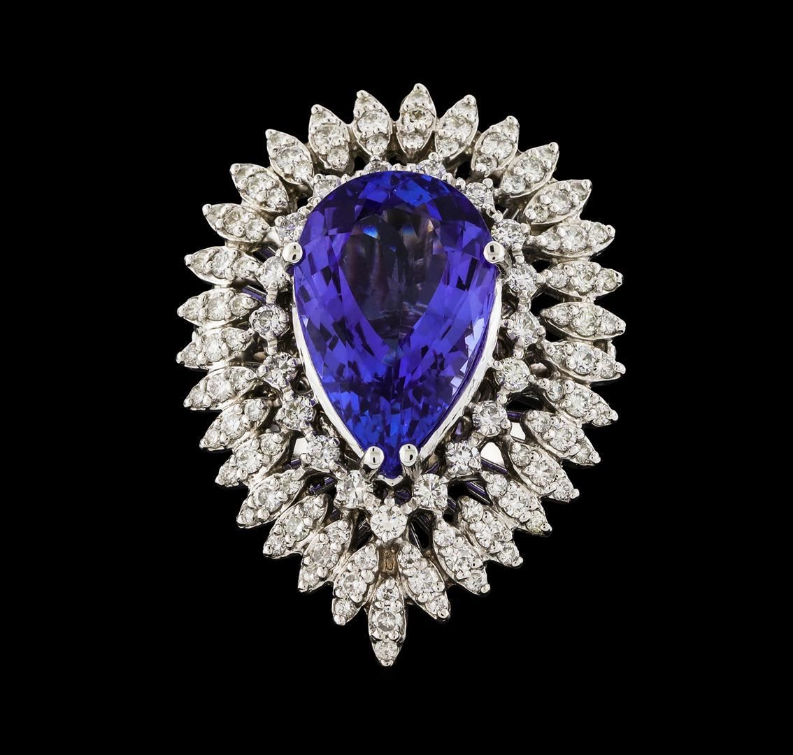 One electronically tested 14KT white gold lady's cast fashion ring with a triple basket halo with a bright polish finish. The featured lady's ring has a shank measuring 3.26 millimeters wide. Identified with markings of 'K14'. Condition is new, good workmanship. Containing: One prong set pear modified brilliant cut natural tanzanite, measuring 16.90 x 10.93 x 6.92mm, (depth est.) approximate weight of 8.48ct., clarity is eye clean, medium, moderately strong, violetish blue color, (GIA vB 5/4), cut is very good. Transmitting light with no distortion, transparent. Colored gemstones are presumed to have been subjected to commonly used enhancement processes. Graded loose prior to setting in the GIA Laboratory, Report #1172847783. Nineteen prong set round brilliant cut diamonds, measuring 2.00 - 1.90 x 1.21mm (depth est.) approximate total weight of 19 Stones = 0.53ct. Graded in the setting. Clarity SI-1 to SI-2. Color: H - I Cut Good Thirty-Two prong set round brilliant cut diamonds, measuring 1.70 - 1.60 x 1.02mm (depth est.) approximate total weight of 32 Stones = 0.54ct. Graded in the setting. Clarity SI-1 to SI-2. Color: H - I Cut Good Sixty-Four prong set round brilliant cut diamonds, measuring 1.25 - 1.15 x 0.72mm (depth est.) approximate total weight of 64 Stones = 0.40ct. Graded in the setting. Clarity SI-1 to I-1. Color: H - I Cut Good. Total Weight of Colored Stones 8.48ct.. Total Weight of Diamonds 1.47ct.. Total Weight of Ring 12.90gm. GAS Appraised.