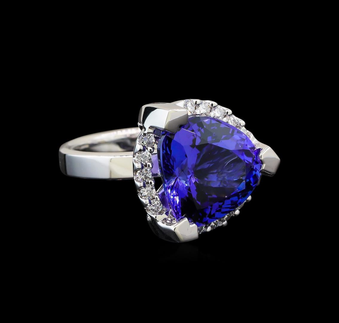 One electronically tested 14KT white gold lady's cast fashion ring with a halo with a bright polish finish. The featured lady's ring has a shank measuring 3.18 millimeters wide. Identified with markings of '14K'. Condition is new, good workmanship. Containing: One prong set pear modified brilliant cut natural tanzanite, measuring 12.81 x 13.45 x 8.06mm, (depth est.) approximate weight of 8.52ct., clarity is eye clean, medium dark, moderately strong, violetish blue color, (GIA vB 6/4), cut is very good. Transmitting light with no distortion, transparent. Colored gemstones are presumed to have been subjected to commonly used enhancement processes. Graded loose prior to setting in the GIA Laboratory, Report #2171668310. Fifteen prong set round brilliant cut diamonds, measuring 1.80 - 1.70 x 1.09mm (depth est.) approximate total weight of 15 Stones = 0.30ct. Graded in the setting. Clarity SI-1 to I-1. Color: H - I Cut Good. Total Weight of Colored Stones 8.52ct.. Total Weight of Diamonds 0.30ct.. Total Weight of Ring 9.40gm. GAS Appraised at $16,710.00.