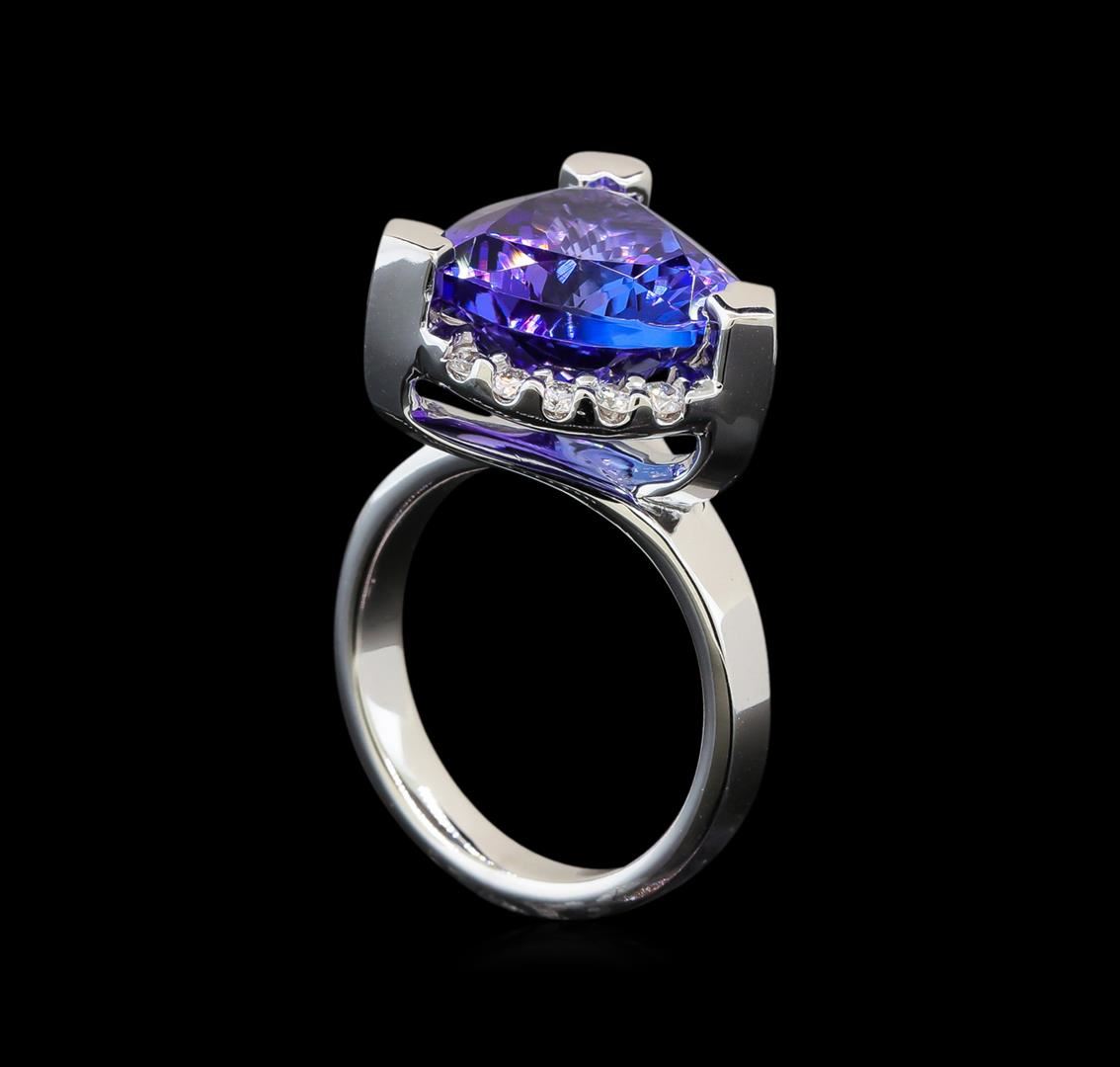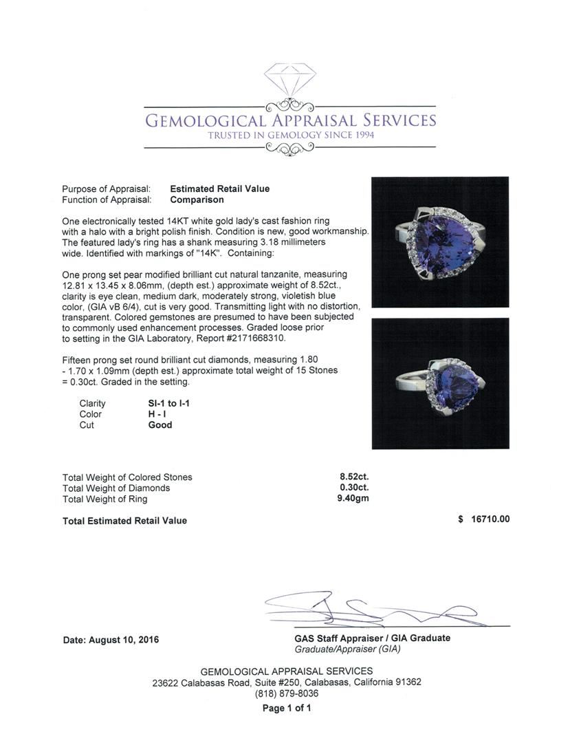 One electronically tested 14KT white gold lady's cast fashion ring with a halo with a bright polish finish. The featured lady's ring has a shank measuring 3.18 millimeters wide. Identified with markings of '14K'. Condition is new, good workmanship. Containing: One prong set pear modified brilliant cut natural tanzanite, measuring 12.81 x 13.45 x 8.06mm, (depth est.) approximate weight of 8.52ct., clarity is eye clean, medium dark, moderately strong, violetish blue color, (GIA vB 6/4), cut is very good. Transmitting light with no distortion, transparent. Colored gemstones are presumed to have been subjected to commonly used enhancement processes. Graded loose prior to setting in the GIA Laboratory, Report #2171668310. Fifteen prong set round brilliant cut diamonds, measuring 1.80 - 1.70 x 1.09mm (depth est.) approximate total weight of 15 Stones = 0.30ct. Graded in the setting. Clarity SI-1 to I-1. Color: H - I Cut Good. Total Weight of Colored Stones 8.52ct.. Total Weight of Diamonds 0.30ct.. Total Weight of Ring 9.40gm. GAS Appraised at $16,710.00.