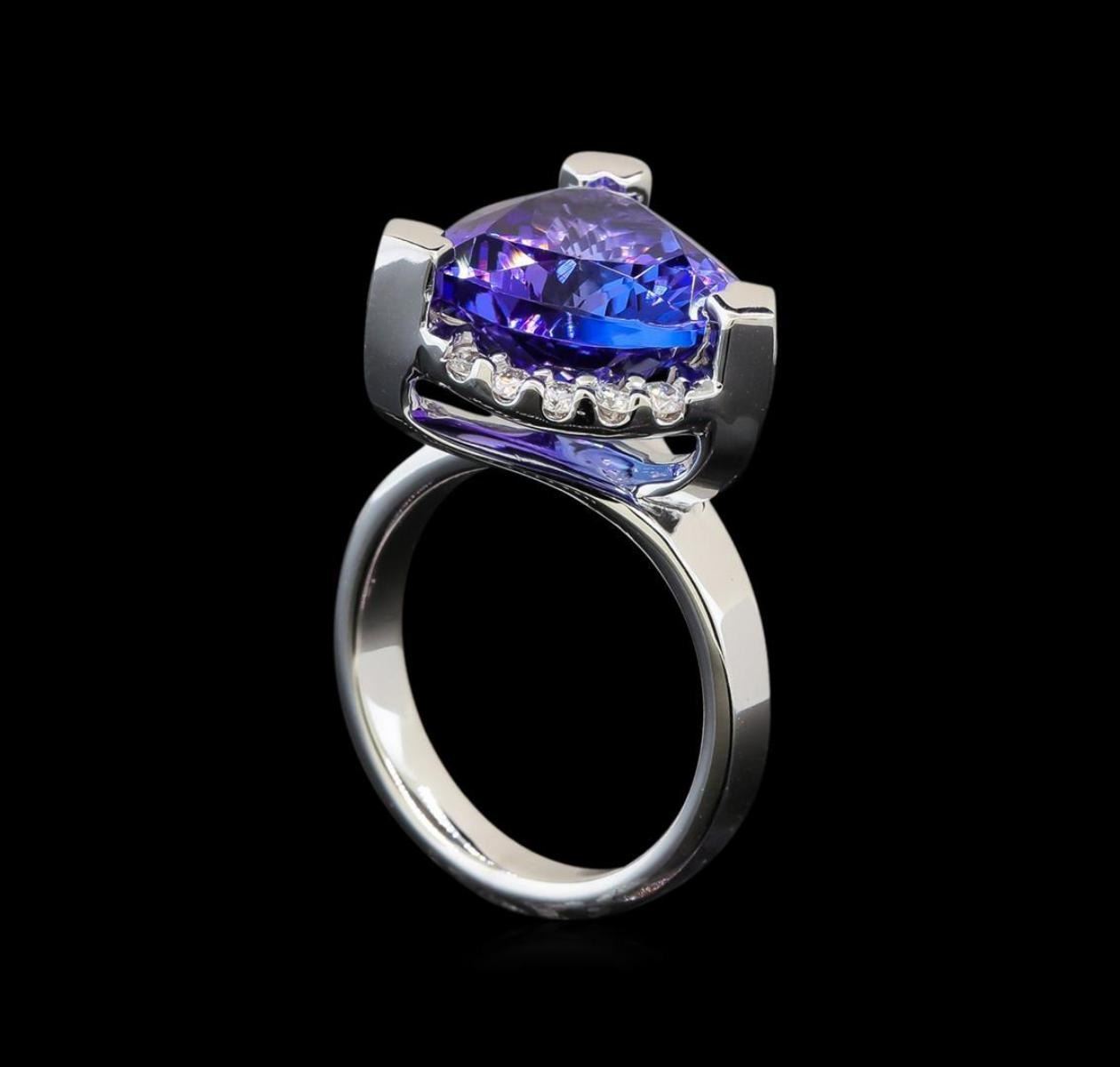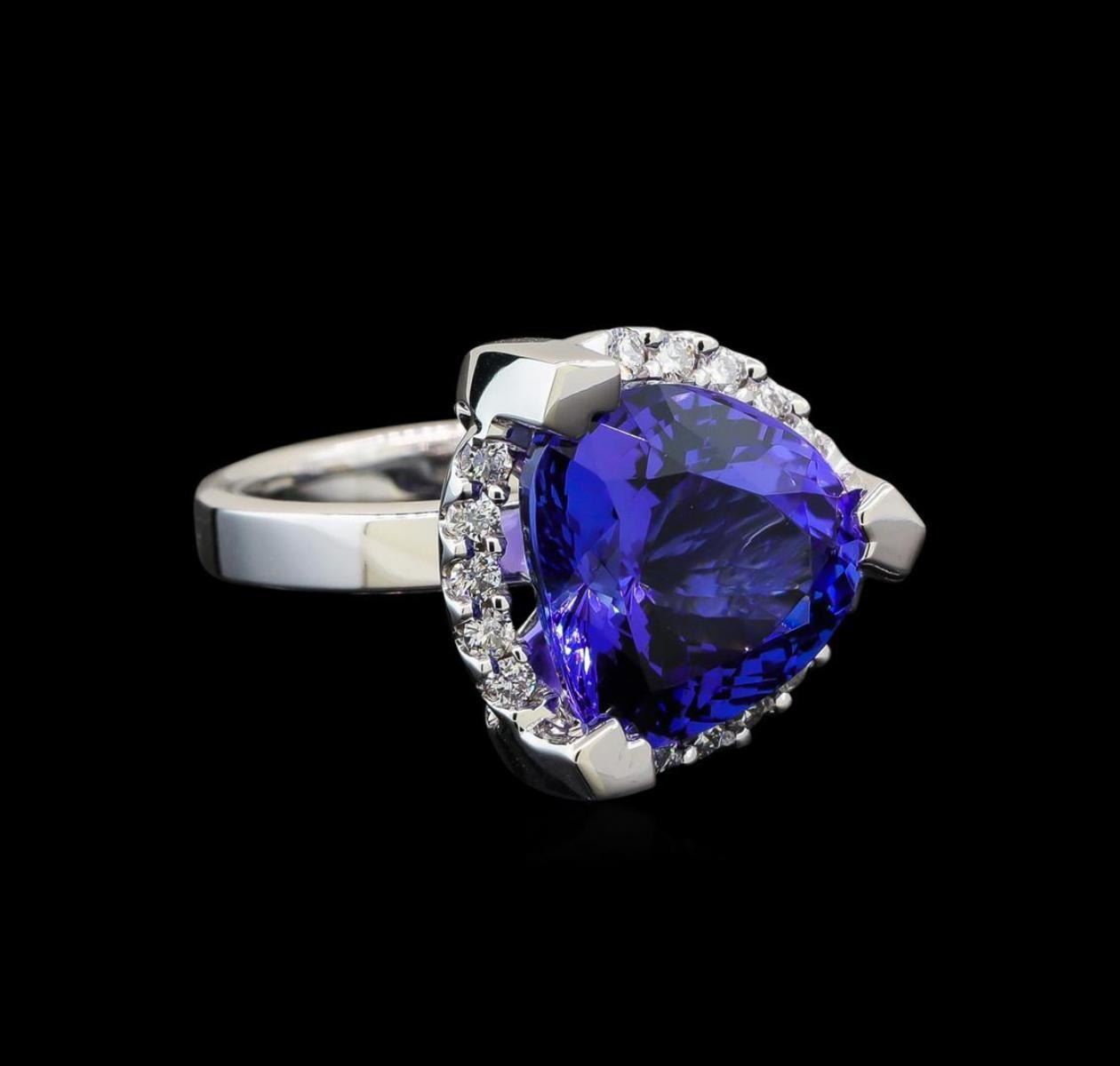 One electronically tested 14KT white gold lady's cast fashion ring with a halo with a bright polish finish. The featured lady's ring has a shank measuring 3.18 millimeters wide. Identified with markings of '14K'. Condition is new, good workmanship. Containing: One prong set pear modified brilliant cut natural tanzanite, measuring 12.81 x 13.45 x 8.06mm, (depth est.) approximate weight of 8.52ct., clarity is eye clean, medium dark, moderately strong, violetish blue color, (GIA vB 6/4), cut is very good. Transmitting light with no distortion, transparent. Colored gemstones are presumed to have been subjected to commonly used enhancement processes. Graded loose prior to setting in the GIA Laboratory, Report #2171668310. Fifteen prong set round brilliant cut diamonds, measuring 1.80 - 1.70 x 1.09mm (depth est.) approximate total weight of 15 Stones = 0.30ct. Graded in the setting. Clarity SI-1 to I-1. Color: H - I Cut Good. Total Weight of Colored Stones 8.52ct.. Total Weight of Diamonds 0.30ct.. Total Weight of Ring 9.40gm. GAS Appraised.