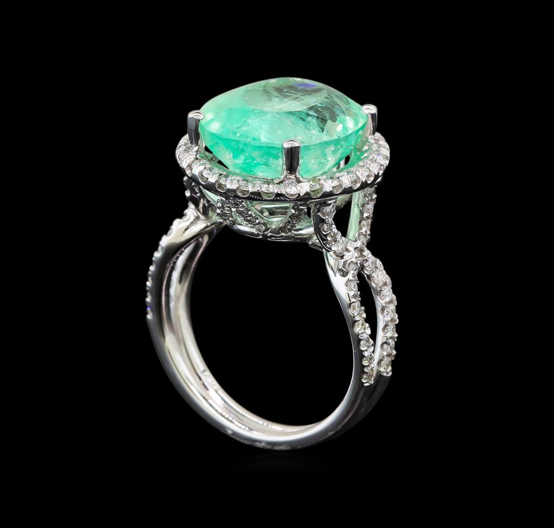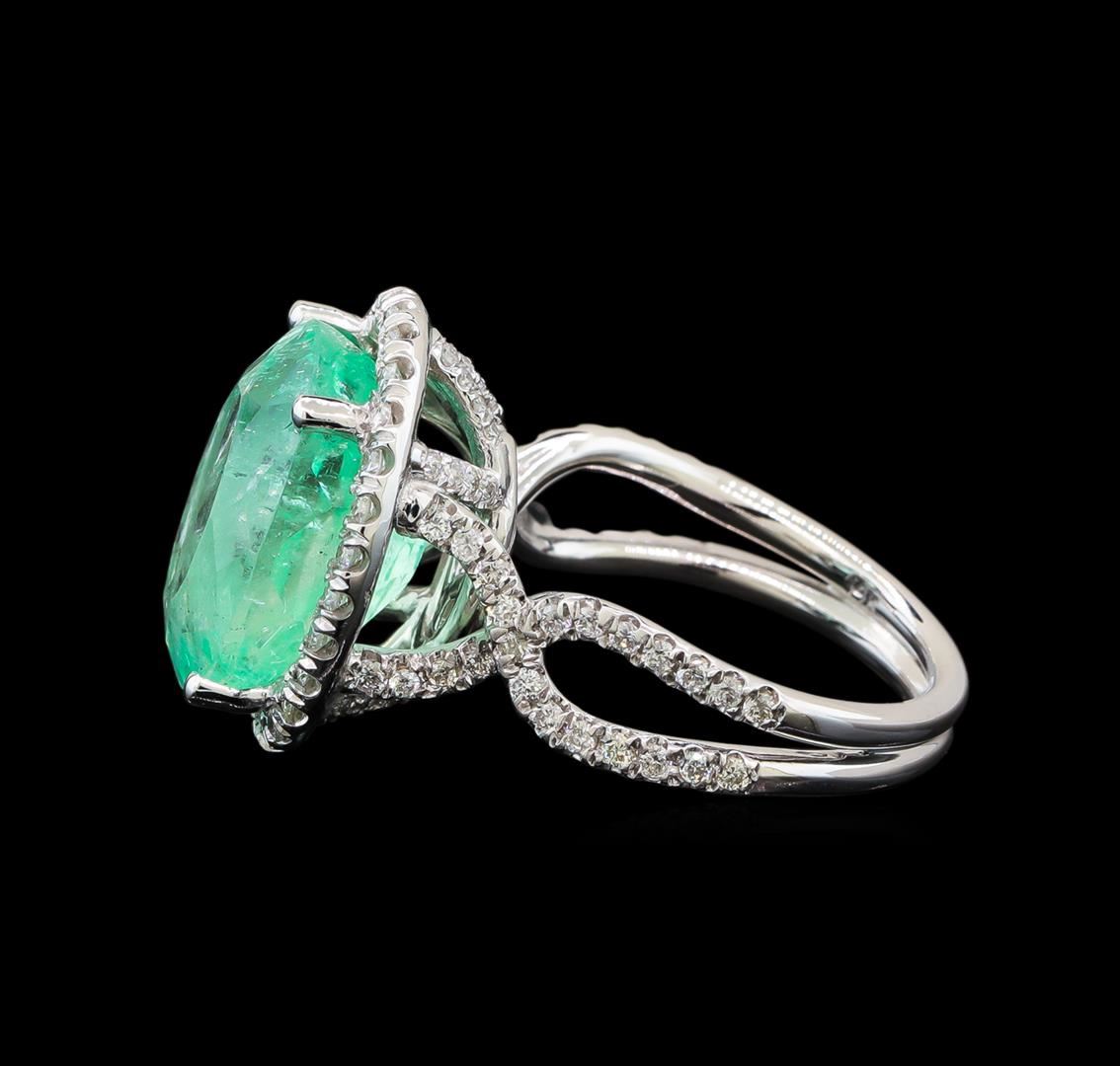 One electronically tested 14KT white gold ladies cast emerald and diamond ring with a bright polish finish. The featured emerald is set within a diamond bezel supported by a diamond lattice under gallery and intertwining diamond ribbon shoulders, completed by a three millimeter wide grooved band. Identified with markings of '14K'. Condition is new, good workmanship. Containing: One prong set oval modified brilliant cut natural emerald, measuring 14.48 x 12.00 x 8.22mm, exact weight 8.54ct., clarity is moderately included, type III, medium light, very slightly grayish, green color, (GIA G 4/3), cut is good. Transmitting light with a minimum of distortion, transparent. Naturally occurring internal & external characteristics are present. Moderate clarity enhancement. GIA Gemological Report attached. Graded loose prior to setting in the GIA Laboratory, Report #1176665560. Seventy-Four prong set round brilliant cut diamonds, measuring 1.40 - 1.30 x 0.81mm (depth est.) approximate total weight of 74 Stones = 0.70ct. The color grade reflects the entire range of color for this group. Graded in the setting. Clarity SI-2 to I-2. Color: F - I Thirty-Two prong set round brilliant cut diamonds, measuring 1.10 - 1.00 x 0.63mm (depth est.) approximate total weight of 32 Stones = 0.16ct. Graded in the setting. Clarity SI-2 to I-2. Color: G - I. Total Weight of Colored Stones 8.54ct.. Total Weight of Diamonds 0.86ct.. Total Weight of Ring 7.77gm. AIG Appraised at $16,260.00.