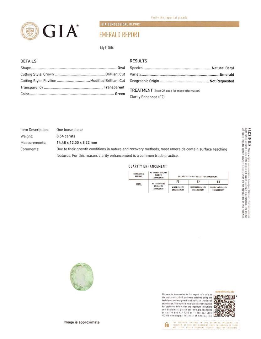 One electronically tested 14KT white gold ladies cast emerald and diamond ring with a bright polish finish. The featured emerald is set within a diamond bezel supported by a diamond lattice under gallery and intertwining diamond ribbon shoulders, completed by a three millimeter wide grooved band. Identified with markings of '14K'. Condition is new, good workmanship. Containing: One prong set oval modified brilliant cut natural emerald, measuring 14.48 x 12.00 x 8.22mm, exact weight 8.54ct., clarity is moderately included, type III, medium light, very slightly grayish, green color, (GIA G 4/3), cut is good. Transmitting light with a minimum of distortion, transparent. Naturally occurring internal & external characteristics are present. Moderate clarity enhancement. GIA Gemological Report attached. Graded loose prior to setting in the GIA Laboratory, Report #1176665560. Seventy-Four prong set round brilliant cut diamonds, measuring 1.40 - 1.30 x 0.81mm (depth est.) approximate total weight of 74 Stones = 0.70ct. The color grade reflects the entire range of color for this group. Graded in the setting. Clarity SI-2 to I-2. Color: F - I Thirty-Two prong set round brilliant cut diamonds, measuring 1.10 - 1.00 x 0.63mm (depth est.) approximate total weight of 32 Stones = 0.16ct. Graded in the setting. Clarity SI-2 to I-2. Color: G - I. Total Weight of Colored Stones 8.54ct.. Total Weight of Diamonds 0.86ct.. Total Weight of Ring 7.77gm. AIG Appraised at $16,260.00.