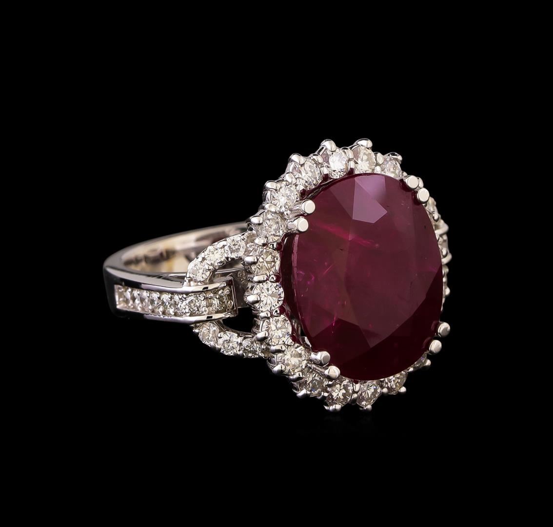 One electronically tested 14KT white gold lady's cast fashion ring with a split shank cathedral basket halo with a bright polish finish. The featured lady's ring has a shank measuring 3.58 millimeters in width. Identified with markings of 'K14'. Condition is new, good workmanship. Containing: One prong set oval modified mixed cut natural ruby, measuring 14.16 x 11.85 x 5.54mm, (depth est.) 10%. bulge factor, approximate weight of 8.62ct., clarity is heavily included, medium dark, moderately strong, slightly purplish red color, (GIA slpR 6/4), cut is very good. Transmitting light somewhat diffusely, transparent to translucent. Indications of laboratory high temperature heat treatment. Naturally occurring internal & external characteristics are present. Colored gemstones are presumed to have been subjected to commonly used enhancement processes. Graded loose prior to setting in the GIA Laboratory, Report #5171603381. Twenty prong set round brilliant cut diamonds, measuring 2.20 - 2.15 x 1.35mm (depth est.) approximate total weight of 20 Stones = 0.77ct. Graded in the setting. Clarity SI-1 to SI-2. Color: H - I Cut Good Twenty-Eight prong set round brilliant cut diamonds, measuring 1.60 - 1.55 x 0.98mm (depth est.) approximate total weight of 28 Stones = 0.42ct. Graded in the setting. Clarity SI-1 to I-1. Color: H - I Cut Good. Total Weight of Colored Stones 8.62ct.. Total Weight of Diamonds 1.19ct.. Total Weight of Ring 8.90gm. GAS Appraised at $25,490.00.