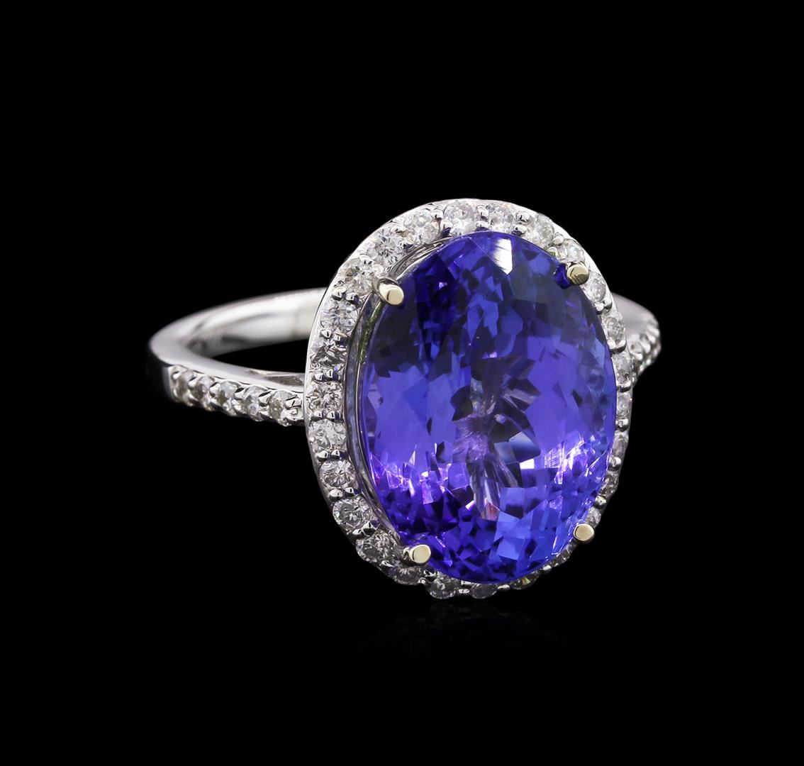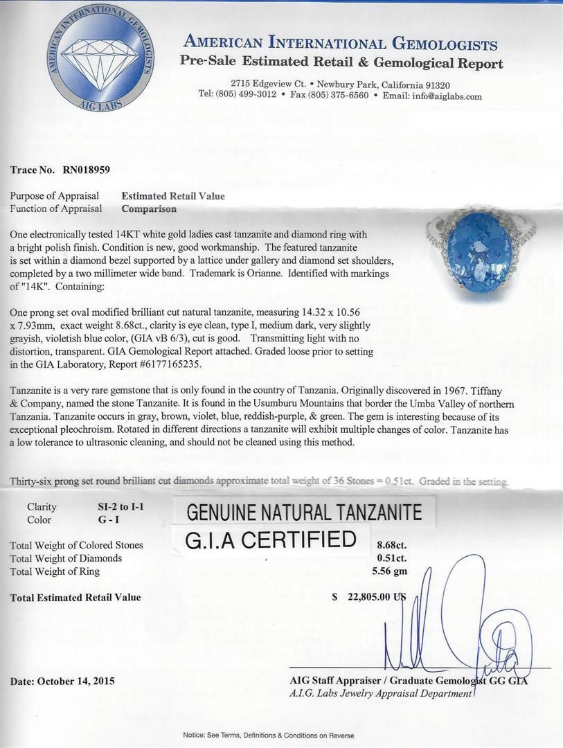 One electronically tested 14KT white gold ladies cast tanzanite and diamond ring with a bright polish finish. The featured tanzanite is set within a diamond bezel supported by a lattice under gallery and diamond set shoulders, completed by a two millimeter wide band. Trademark is Orianne. Identified with markings of "14K". Condition is new, good workmanship. Containing: One prong set oval modified brilliant cut natural tanzanite, measuring 14.32 x 10.56 x 7.93mm, exact weight 8.68ct., clarity is eye clean, type I, medium dark, very slightly grayish, violetish blue color, (GIA vB 6/3), cut is good. Transmitting light with no distortion, transparent. GIA Gemological Report attached. Graded loose prior to setting in the GIA Laboratory, Report #6177165235.Tanzanite is a very rare gemstone that is only found in the country of Tanzania. Originally discovered in 1967. Tiffany & Company, named the stone Tanzanite. It is found in the Usumburu Mountains that border the Umba Valley of northern Tanzania. Tanzanite occurs in gray, brown, violet, blue, reddish-purple, & green. The gem is interesting because of its exceptional pleochroism. Rotated in different directions a tanzanite will exhibit multiple changes of color. Tanzanite has a low tolerance to ultrasonic cleaning, and should not be cleaned using this method. Thirty-Six prong set round brilliant cut diamonds approximate total weight of 36 Stones = 0.51ct. Graded in the setting. Clarity: SI-2 to I-1. Color: G - I. Total Weight of Colored Stones 8.68ct. Total Weight of Diamonds 0.51ct. Total Weight of Ring 5.56gm. AIG Appraised at $22,805.00.