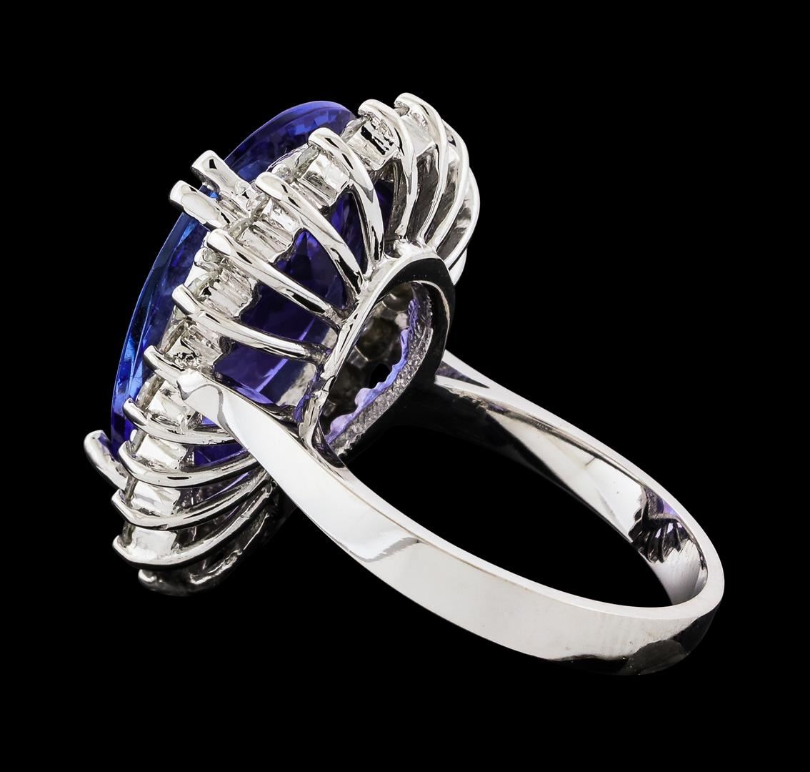 One electronically tested 14KT white gold lady's cast fashion ring with a basket halo with a bright polish finish. The featured lady's ring has a shank measuring 2.98 millimeters wide. Identified with markings of 'K14'. Condition is new, good workmanship. Containing: One prong set pear modified brilliant cut natural tanzanite, measuring 18.97 x 11.92 x 5.90mm, (depth est.) approximate weight of 8.74ct., clarity is eye clean, medium, moderately strong, bluish violet color, (GIA bV 5/4), cut is very good. Transmitting light with no distortion, transparent. Colored gemstones are presumed to have been subjected to commonly used enhancement processes. Graded loose prior to setting in the GIA Laboratory, Report #1172847884. Twenty-One prong set round brilliant cut diamonds, measuring 2.60 - 2.50 x 1.53mm (depth est.) approximate total weight of 21 Stones = 1.28ct. Graded in the setting. Clarity SI-1 to SI-3. Color: H - I Cut Good. Total Weight of Colored Stones 8.74ct.. Total Weight of Diamonds 1.28ct.. Total Weight of Ring 9.00gm. GAS Appraised at $15,040.00.