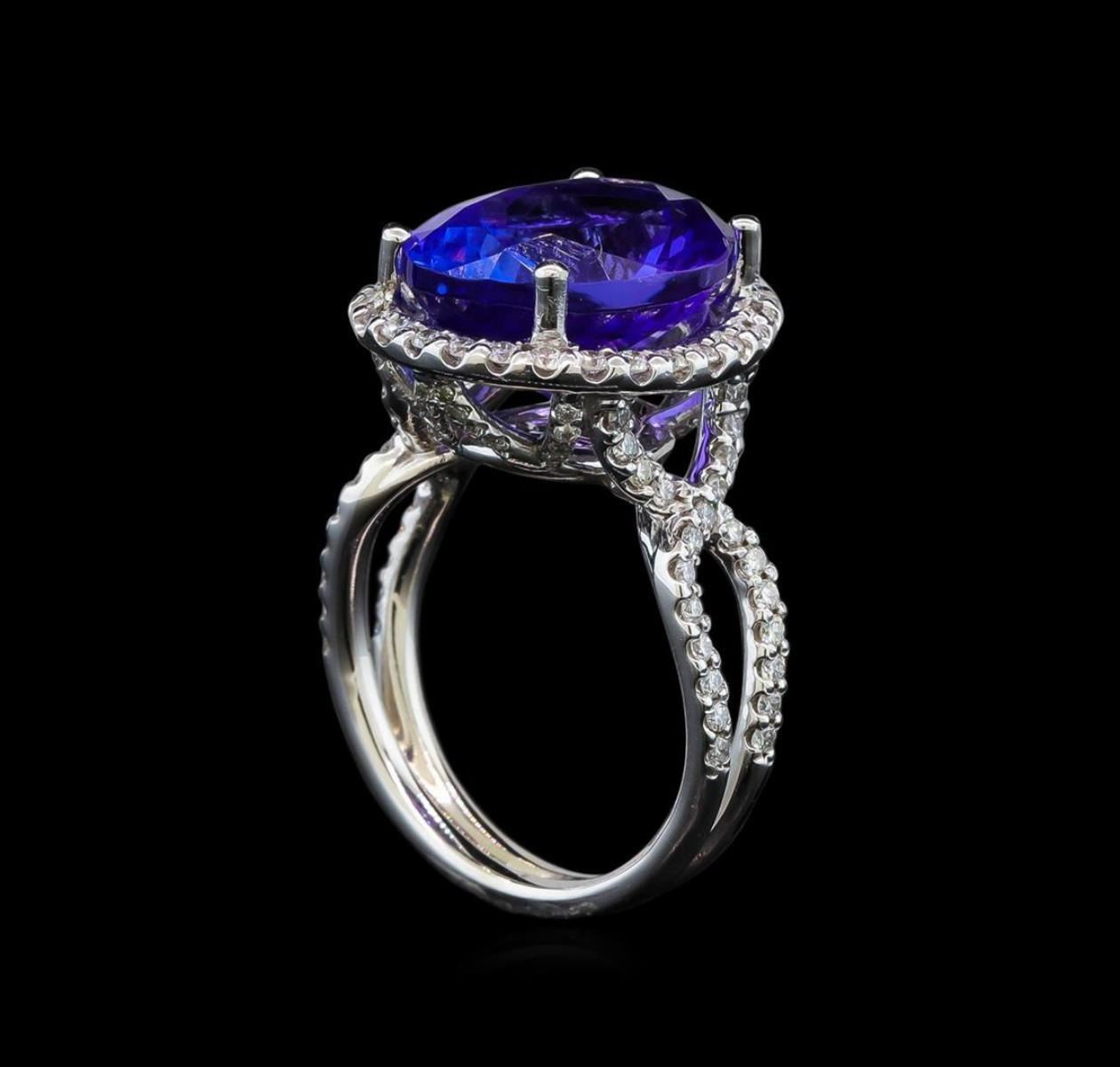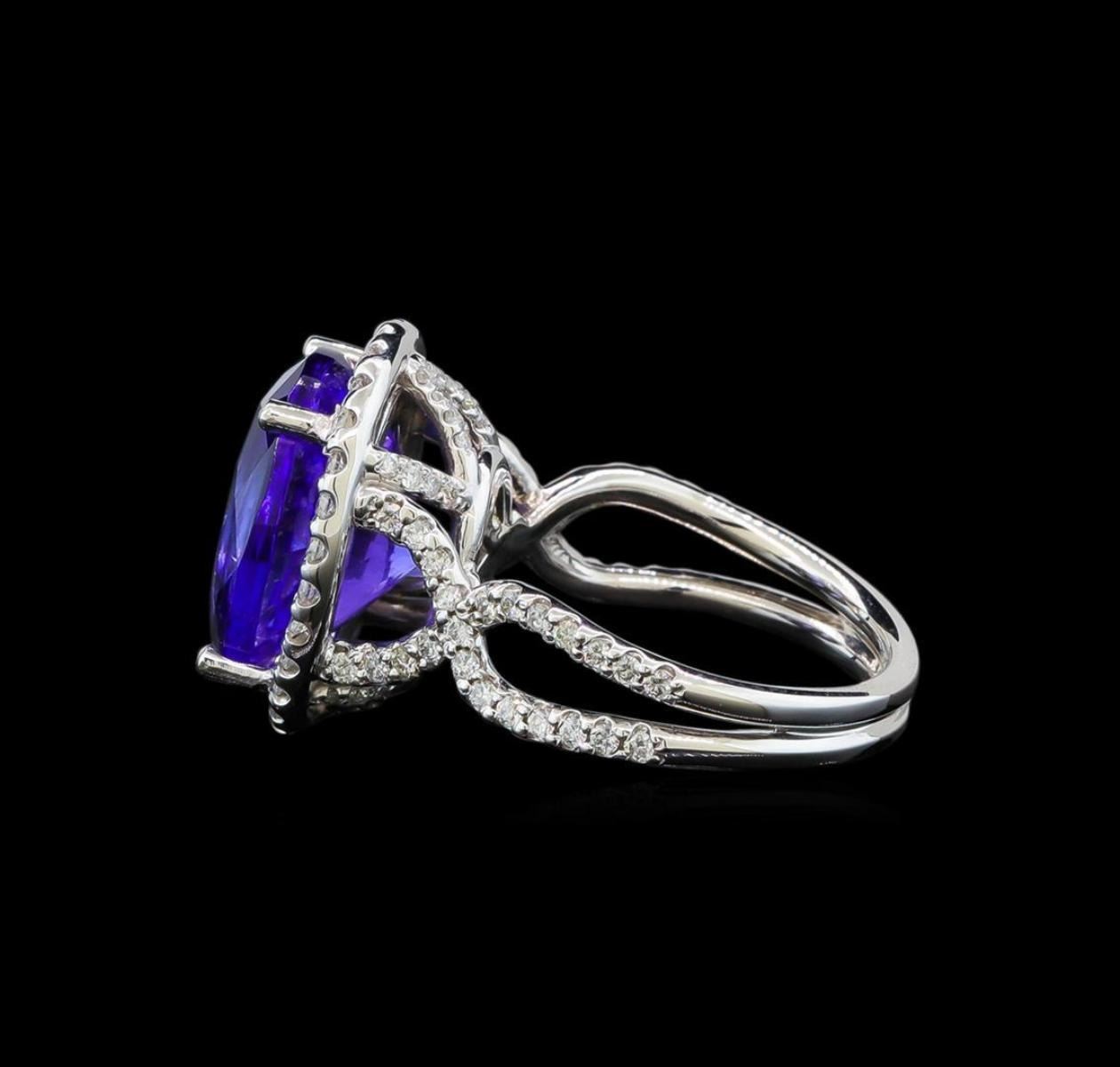 One electronically tested 14KT white gold lady's cast fashion ring with a crossover shank basket halo with a bright polish finish. The featured lady's ring has a double shank measuring 3.16 millimeters wide. Identified with markings of '14K'. Condition is new, good workmanship. Containing: One prong set oval modified brilliant cut natural tanzanite, measuring 13.97 x 11.23 x 7.79mm, (depth est.) 3%. bulge factor, approximate weight of 8.82ct., clarity is eye clean, medium dark, moderately strong, violetish blue color, (GIA vB 6/4), cut is very good. Transmitting light with no distortion, transparent. Colored gemstones are presumed to have been subjected to commonly used enhancement processes. Graded loose prior to setting in the GIA Laboratory, Report #2175665889. Seventy-Four prong set round brilliant cut diamonds, measuring 1.35 - 1.25 x 0.81mm (depth est.) approximate total weight of 74 Stones = 0.63ct. Graded in the setting. Clarity SI-1 to I-1. Color: G - I Cut Good Thirty-Two prong set round brilliant cut diamonds, measuring 1.10 - 1.00 x 0.65mm (depth est.) approximate total weight of 32 Stones = 0.15ct. Graded in the setting. Clarity SI-1 to I-1. Color: H - I Cut Good. Total Weight of Colored Stones 8.82ct.. Total Weight of Diamonds 0.78ct.. Total Weight of Ring 8.30gm. GAS Appraised.