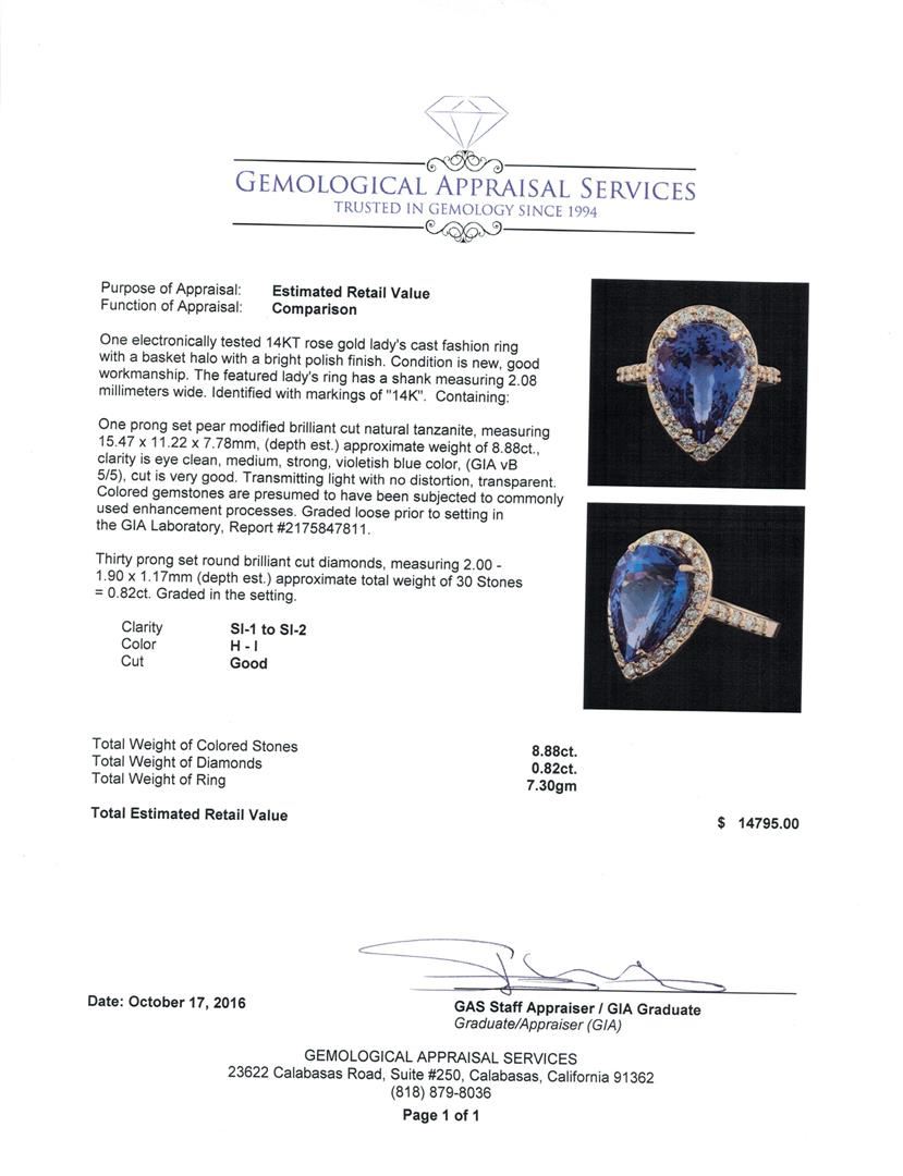 One electronically tested 14KT rose gold lady's cast fashion ring with a basket halo with a bright polish finish. The featured lady's ring has a shank measuring 2.08 millimeters wide. Identified with markings of '14K'. Condition is new, good workmanship. Containing: One prong set pear modified brilliant cut natural tanzanite, measuring 15.47 x 11.22 x 7.78mm, (depth est.) approximate weight of 8.88ct., clarity is eye clean, medium, strong, violetish blue color, (GIA vB 5/5), cut is very good. Transmitting light with no distortion, transparent. Colored gemstones are presumed to have been subjected to commonly used enhancement processes. Graded loose prior to setting in the GIA Laboratory, Report #2175847811. Thirty prong set round brilliant cut diamonds, measuring 2.00 - 1.90 x 1.17mm (depth est.) approximate total weight of 30 Stones = 0.82ct. Graded in the setting. Clarity SI-1 to SI-2. Color: H - I Cut Good. Total Weight of Colored Stones 8.88ct.. Total Weight of Diamonds 0.82ct.. Total Weight of Ring 7.30gm. GAS Appraised at $14,795.00.
