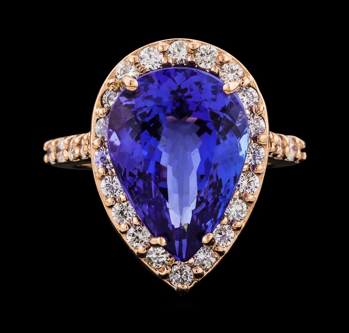 One electronically tested 14KT rose gold lady's cast fashion ring with a basket halo with a bright polish finish. The featured lady's ring has a shank measuring 2.08 millimeters wide. Identified with markings of '14K'. Condition is new, good workmanship. Containing: One prong set pear modified brilliant cut natural tanzanite, measuring 15.47 x 11.22 x 7.78mm, (depth est.) approximate weight of 8.88ct., clarity is eye clean, medium, strong, violetish blue color, (GIA vB 5/5), cut is very good. Transmitting light with no distortion, transparent. Colored gemstones are presumed to have been subjected to commonly used enhancement processes. Graded loose prior to setting in the GIA Laboratory, Report #2175847811. Thirty prong set round brilliant cut diamonds, measuring 2.00 - 1.90 x 1.17mm (depth est.) approximate total weight of 30 Stones = 0.82ct. Graded in the setting. Clarity SI-1 to SI-2. Color: H - I Cut Good. Total Weight of Colored Stones 8.88ct.. Total Weight of Diamonds 0.82ct.. Total Weight of Ring 7.30gm. GAS Appraised at $14,795.00.