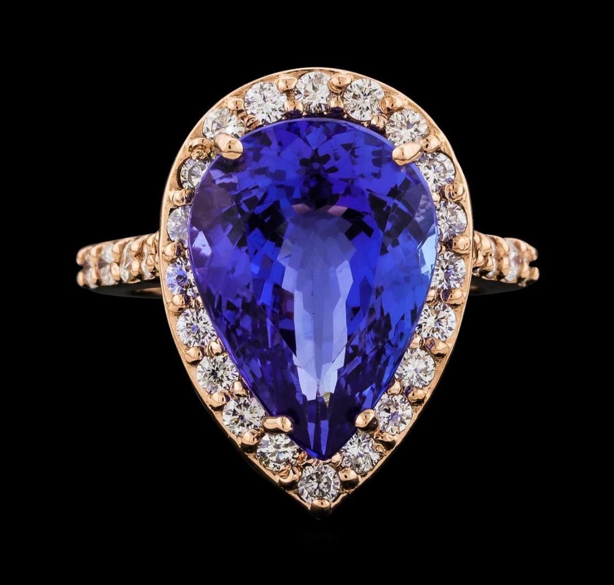 One electronically tested 14KT rose gold lady's cast fashion ring with a basket halo with a bright polish finish. The featured lady's ring has a shank measuring 2.08 millimeters wide. Identified with markings of '14K'. Condition is new, good workmanship. Containing: One prong set pear modified brilliant cut natural tanzanite, measuring 15.47 x 11.22 x 7.78mm, (depth est.) approximate weight of 8.88ct., clarity is eye clean, medium, strong, violetish blue color, (GIA vB 5/5), cut is very good. Transmitting light with no distortion, transparent. Colored gemstones are presumed to have been subjected to commonly used enhancement processes. Graded loose prior to setting in the GIA Laboratory, Report #2175847811. Thirty prong set round brilliant cut diamonds, measuring 2.00 - 1.90 x 1.17mm (depth est.) approximate total weight of 30 Stones = 0.82ct. Graded in the setting. Clarity SI-1 to SI-2. Color: H - I Cut Good. Total Weight of Colored Stones 8.88ct.. Total Weight of Diamonds 0.82ct.. Total Weight of Ring 7.30gm. GAS Appraised.