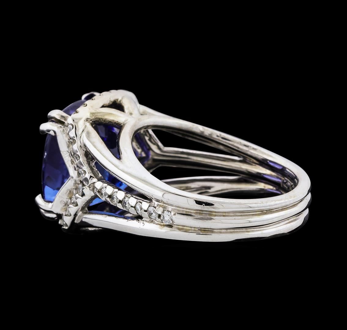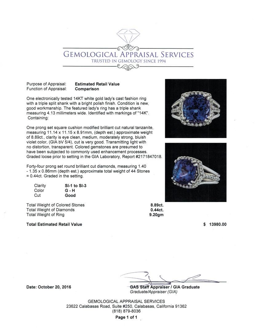 One electronically tested 14KT white gold lady's cast fashion ring with a triple split shank with a bright polish finish. The featured lady's ring has a triple shank measuring 4.13 millimeters wide. Identified with markings of '14K'. Condition is new, good workmanship. Containing: One prong set square cushion modified brilliant cut natural tanzanite, measuring 11.14 x 11.15 x 8.91mm, (depth est.) approximate weight of 8.89ct., clarity is eye clean, medium, moderately strong, bluish violet color, (GIA bV 5/4), cut is very good. Transmitting light with no distortion, transparent. Colored gemstones are presumed to have been subjected to commonly used enhancement processes. Graded loose prior to setting in the GIA Laboratory, Report #2171847018. Forty-Four prong set round brilliant cut diamonds, measuring 1.40 - 1.35 x 0.86mm (depth est.) approximate total weight of 44 Stones = 0.44ct. Graded in the setting. Clarity SI-1 to SI-3. Color: G - H Cut Good. Total Weight of Colored Stones 8.89ct.. Total Weight of Diamonds 0.44ct.. Total Weight of Ring 9.20gm. GAS Appraised at $13,980.00.