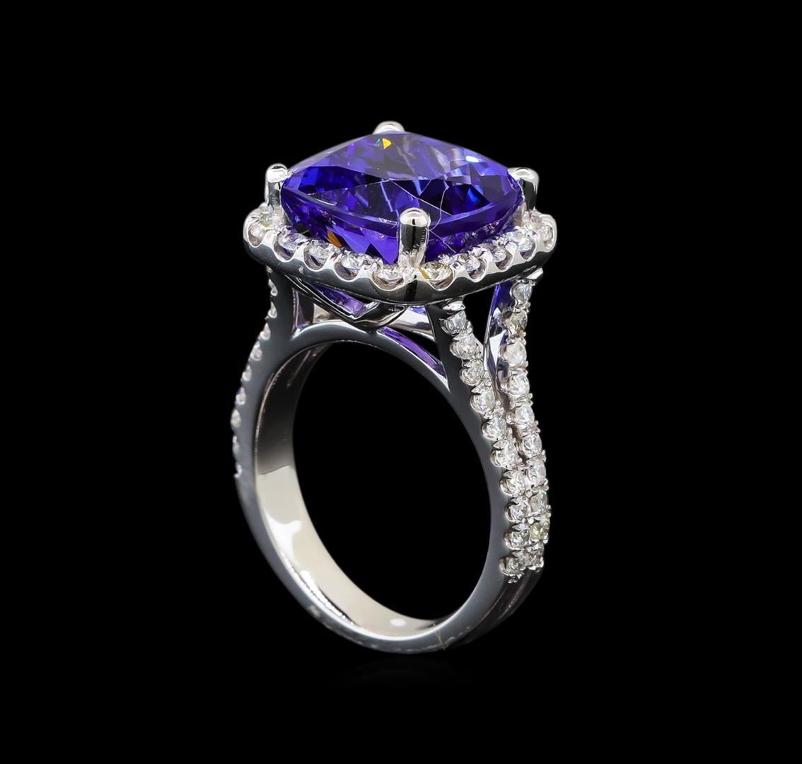 One electronically tested 14KT white gold lady's cast fashion ring with a split shank basket halo with a bright polish finish. The featured lady's ring has a double shank measuring 3.42 millimeters wide. Identified with markings of '14K'. Condition is new, good workmanship. Containing: One prong set square cushion modified brilliant cut natural tanzanite, measuring 11.80 x 11.71 x 8.63mm, (depth est.) approximate weight of 9.06ct., clarity is eye clean, medium dark, moderately strong, bluish violet color, (GIA bV 6/4), cut is very good. Transmitting light with no distortion, transparent. Colored gemstones are presumed to have been subjected to commonly used enhancement processes. Graded loose prior to setting in the GIA Laboratory, Report #1176665868. Sixty prong set round brilliant cut diamonds, measuring 1.65 - 1.55 x 0.99mm (depth est.) approximate total weight of 60 Stones = 0.95ct. Graded in the setting. Clarity SI-1 to I-1. Color: G - H Cut Good. Total Weight of Colored Stones 9.06ct.. Total Weight of Diamonds 0.95ct.. Total Weight of Ring 8.40gm. GAS Appraised at $18,750.00.