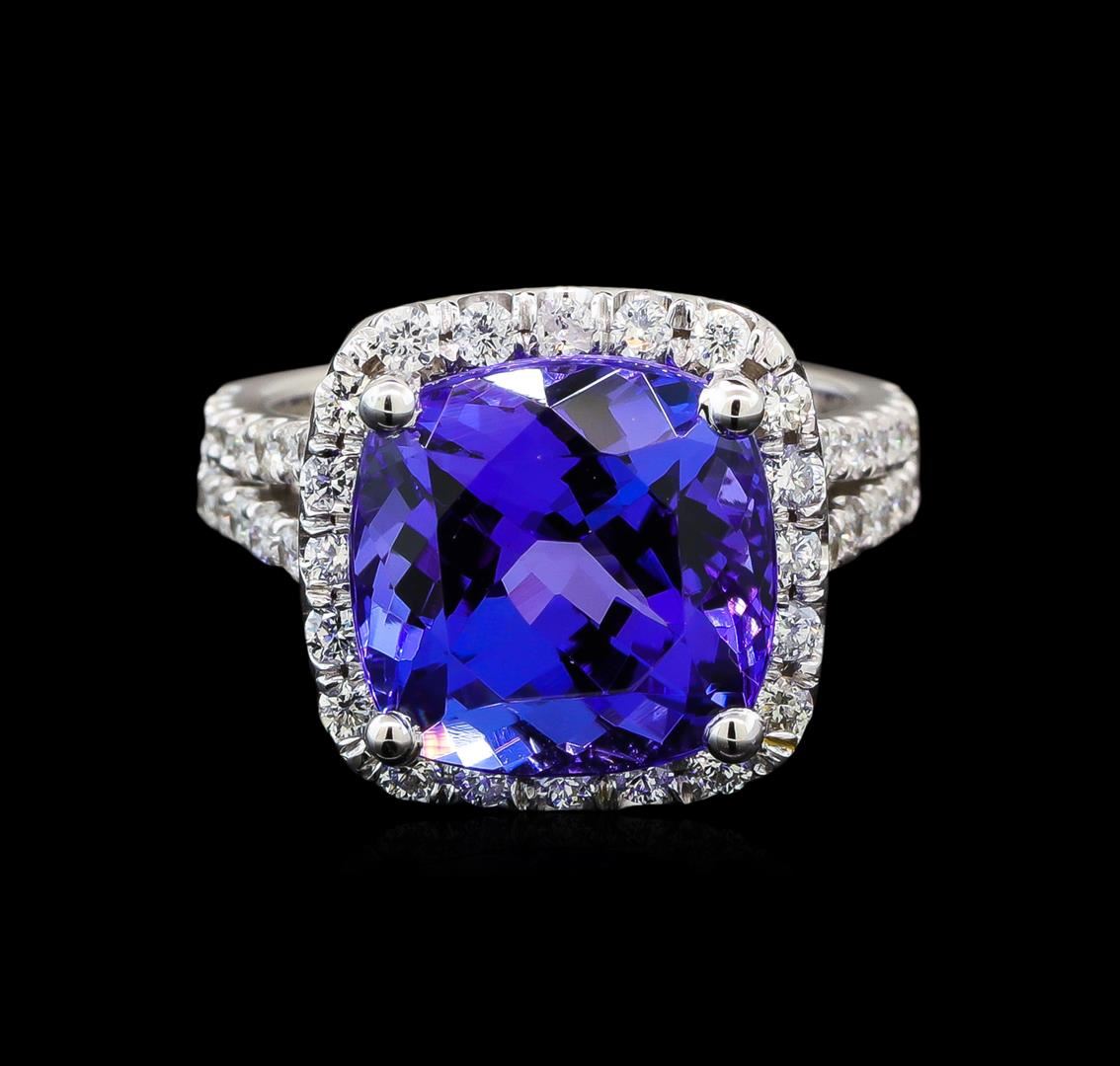 One electronically tested 14KT white gold lady's cast fashion ring with a split shank basket halo with a bright polish finish. The featured lady's ring has a double shank measuring 3.42 millimeters wide. Identified with markings of '14K'. Condition is new, good workmanship. Containing: One prong set square cushion modified brilliant cut natural tanzanite, measuring 11.80 x 11.71 x 8.63mm, (depth est.) approximate weight of 9.06ct., clarity is eye clean, medium dark, moderately strong, bluish violet color, (GIA bV 6/4), cut is very good. Transmitting light with no distortion, transparent. Colored gemstones are presumed to have been subjected to commonly used enhancement processes. Graded loose prior to setting in the GIA Laboratory, Report #1176665868. Sixty prong set round brilliant cut diamonds, measuring 1.65 - 1.55 x 0.99mm (depth est.) approximate total weight of 60 Stones = 0.95ct. Graded in the setting. Clarity SI-1 to I-1. Color: G - H Cut Good. Total Weight of Colored Stones 9.06ct.. Total Weight of Diamonds 0.95ct.. Total Weight of Ring 8.40gm. GAS Appraised at $18,750.00.