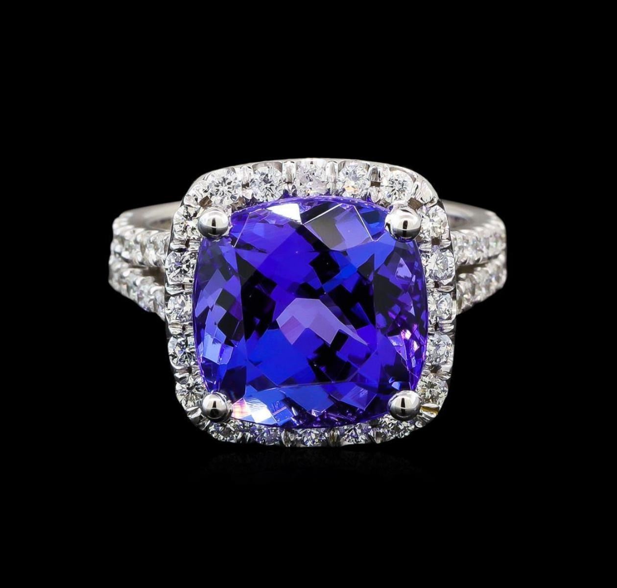 One electronically tested 14KT white gold lady's cast fashion ring with a split shank basket halo with a bright polish finish. The featured lady's ring has a double shank measuring 3.42 millimeters wide. Identified with markings of '14K'. Condition is new, good workmanship. Containing: One prong set square cushion modified brilliant cut natural tanzanite, measuring 11.80 x 11.71 x 8.63mm, (depth est.) approximate weight of 9.06ct., clarity is eye clean, medium dark, moderately strong, bluish violet color, (GIA bV 6/4), cut is very good. Transmitting light with no distortion, transparent. Colored gemstones are presumed to have been subjected to commonly used enhancement processes. Graded loose prior to setting in the GIA Laboratory, Report #1176665868. Sixty prong set round brilliant cut diamonds, measuring 1.65 - 1.55 x 0.99mm (depth est.) approximate total weight of 60 Stones = 0.95ct. Graded in the setting. Clarity SI-1 to I-1. Color: G - H Cut Good. Total Weight of Colored Stones 9.06ct.. Total Weight of Diamonds 0.95ct.. Total Weight of Ring 8.40gm. GAS Appraised.