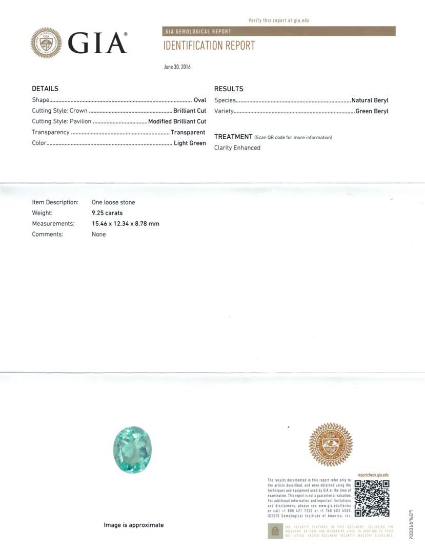 One electronically tested 14KT white gold lady's cast fashion ring with a split shank double basket halo with a bright polish finish. The featured lady's ring has a shank measuring 2.67 millimeters wide. Identified with markings of '14K'. Condition is new, good workmanship. Containing: One prong set oval modified brilliant cut natural emerald, measuring 15.46 x 12.34 x 8.78mm, (depth est.) approximate weight of 9.25ct., clarity is slightly included, light, moderately strong, green color, (GIA G 3/4), cut is fair. Transmitting light with a minimum of distortion, transparent. Clarity enhanced. Colored gemstones are presumed to have been subjected to commonly used enhancement processes. Graded loose prior to setting in the GIA Laboratory, Report #1176664620. Twenty prong set round brilliant cut diamonds, measuring 2.40 - 2.30 x 1.41mm (depth est.) approximate total weight of 20 Stones = 0.94ct. Graded in the setting. Clarity SI-1 to I-1. Color: H - I Cut Good Twenty prong set round brilliant cut diamonds, measuring 1.70 - 1.60 x 0.99mm (depth est.) approximate total weight of 20 Stones = 0.32ct. Graded in the setting. Clarity SI-1 to SI-2. Color: H - I Cut Good. Total Weight of Colored Stones 9.25ct.. Total Weight of Diamonds 1.26ct.. Total Weight of Ring 11.40gm. GAS Appraised at $11,865.00.