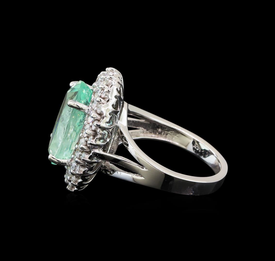 One electronically tested 14KT white gold lady's cast fashion ring with a split shank double basket halo with a bright polish finish. The featured lady's ring has a shank measuring 2.67 millimeters wide. Identified with markings of '14K'. Condition is new, good workmanship. Containing: One prong set oval modified brilliant cut natural emerald, measuring 15.46 x 12.34 x 8.78mm, (depth est.) approximate weight of 9.25ct., clarity is slightly included, light, moderately strong, green color, (GIA G 3/4), cut is fair. Transmitting light with a minimum of distortion, transparent. Clarity enhanced. Colored gemstones are presumed to have been subjected to commonly used enhancement processes. Graded loose prior to setting in the GIA Laboratory, Report #1176664620. Twenty prong set round brilliant cut diamonds, measuring 2.40 - 2.30 x 1.41mm (depth est.) approximate total weight of 20 Stones = 0.94ct. Graded in the setting. Clarity SI-1 to I-1. Color: H - I Cut Good Twenty prong set round brilliant cut diamonds, measuring 1.70 - 1.60 x 0.99mm (depth est.) approximate total weight of 20 Stones = 0.32ct. Graded in the setting. Clarity SI-1 to SI-2. Color: H - I Cut Good. Total Weight of Colored Stones 9.25ct.. Total Weight of Diamonds 1.26ct.. Total Weight of Ring 11.40gm. GAS Appraised at $11,865.00.