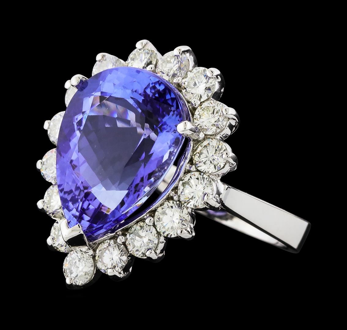 One electronically tested 14KT white gold lady's cast fashion ring with a basket halo with a bright polish finish. The featured lady's ring has a shank measuring 2.80 millimeters wide. Identified with markings of 'K14'. Condition is new, good workmanship. Containing: One prong set pear modified brilliant cut natural tanzanite, measuring 15.32 x 11.80 x 7.90mm, (depth est.) approximate weight of 9.31ct., clarity is eye clean, medium light, moderately strong, violet color, (GIA V 4/4), cut is very good. Transmitting light with no distortion, transparent. Colored gemstones are presumed to have been subjected to commonly used enhancement processes. Graded loose prior to setting in the GIA Laboratory, Report #6177847911. Sixteen prong set round brilliant cut diamonds, measuring 3.10 - 3.00 x 1.83mm (depth est.) approximate total weight of 16 Stones = 1.66ct. Graded in the setting. Clarity SI-1 to I-1. Color: H - I Cut Good. Total Weight of Colored Stones 9.31ct.. Total Weight of Diamonds 1.66ct.. Total Weight of Ring 8.10gm. GAS Appraised at $12,890.00.