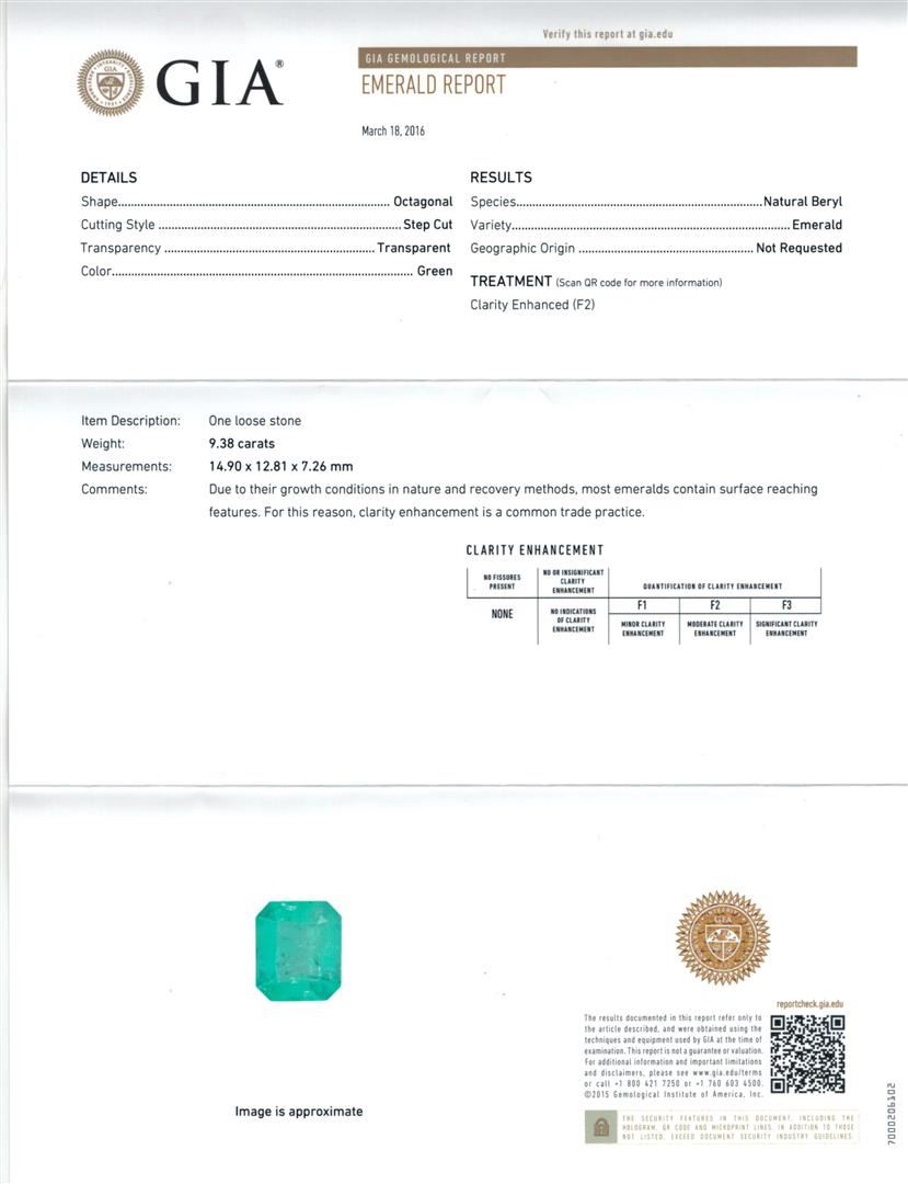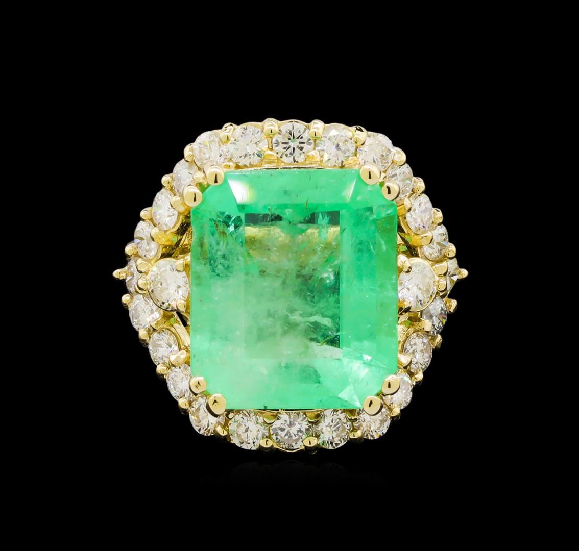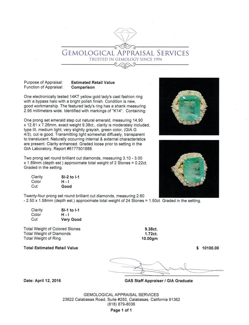 One electronically tested 14KT yellow gold lady's cast fashion ring with a bypass halo with a bright polish finish. The featured lady's ring has a shank measuring 2.95 millimeters wide. Identified with markings of "K14". Condition is new, good workmanship. Containing: One prong set emerald step cut natural emerald, measuring 14.90 x 12.81 x 7.26mm, exact weight 9.38ct., clarity is moderately included, type III, medium light, very slightly grayish, green color, (GIA G 4/3), cut is good. Transmitting light somewhat diffusely, transparent to translucent. Naturally occurring internal & external characteristics are present. Clarity enhanced. Graded loose prior to setting in the GIA Laboratory, Report #6177501888.Two prong set round brilliant cut diamonds, measuring 3.10 - 3.00 x 1.89mm (depth est.) approximate total weight of 2 Stones = 0.22ct. Graded in the setting. Clarity: SI-2 to I-1. Color: H - I. Cut Good Twenty-Four prong set round brilliant cut diamonds, measuring 2.60 - 2.50 x 1.58mm (depth est.) approximate total weight of 24 Stones = 1.50ct. Graded in the setting. Clarity: SI-1 to I-1. Color: H - I. Cut Very Good. Total Weight of Colored Stones 9.38ct. Total Weight of Diamonds 1.72ct. Total Weight of Ring 10.00gm. GAS Appraised at $10,100.00.