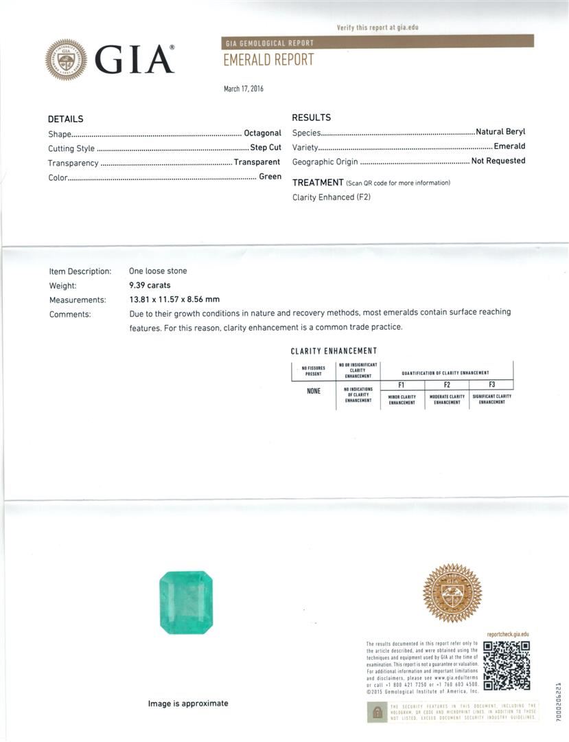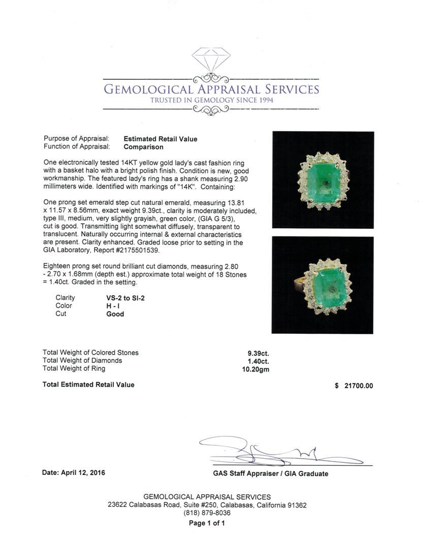 One electronically tested 14KT yellow gold lady's cast fashion ring with a basket halo with a bright polish finish. The featured lady's ring has a shank measuring 2.90 millimeters wide. Identified with markings of "14K". Condition is new, good workmanship. Containing: One prong set emerald step cut natural emerald, measuring 13.81 x 11.57 x 8.56mm, approximate weight of 9.39ct., clarity is moderately included, type III, medium, very slightly grayish, green color, (GIA G 5/3), cut is good. Transmitting light somewhat diffusely, transparent to translucent. Naturally occurring internal & external characteristics are present. Clarity enhanced. Graded loose prior to setting in the GIA Laboratory, Report #2175501539.Eighteen prong set round brilliant cut diamonds, measuring 2.80 - 2.70 x 1.68mm (depth est.) approximate total weight of 18 Stones = 1.40ct. Graded in the setting. Clarity: VS-2 to SI-2. Color: H - I. Cut Good. Total Weight of Colored Stones 9.39ct. Total Weight of Diamonds 1.40ct. Total Weight of Ring 10.20gm. GAS Appraised at $21,700.00.
