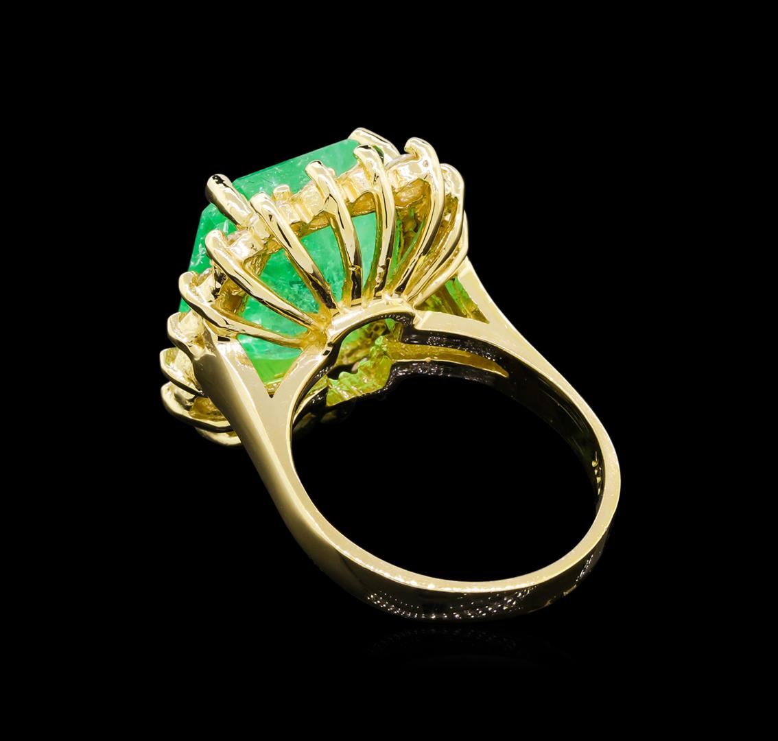 One electronically tested 14KT yellow gold lady's cast fashion ring with a basket halo with a bright polish finish. The featured lady's ring has a shank measuring 2.90 millimeters wide. Identified with markings of "14K". Condition is new, good workmanship. Containing: One prong set emerald step cut natural emerald, measuring 13.81 x 11.57 x 8.56mm, approximate weight of 9.39ct., clarity is moderately included, type III, medium, very slightly grayish, green color, (GIA G 5/3), cut is good. Transmitting light somewhat diffusely, transparent to translucent. Naturally occurring internal & external characteristics are present. Clarity enhanced. Graded loose prior to setting in the GIA Laboratory, Report #2175501539.Eighteen prong set round brilliant cut diamonds, measuring 2.80 - 2.70 x 1.68mm (depth est.) approximate total weight of 18 Stones = 1.40ct. Graded in the setting. Clarity: VS-2 to SI-2. Color: H - I. Cut Good. Total Weight of Colored Stones 9.39ct. Total Weight of Diamonds 1.40ct. Total Weight of Ring 10.20gm. GAS Appraised at $21,700.00.