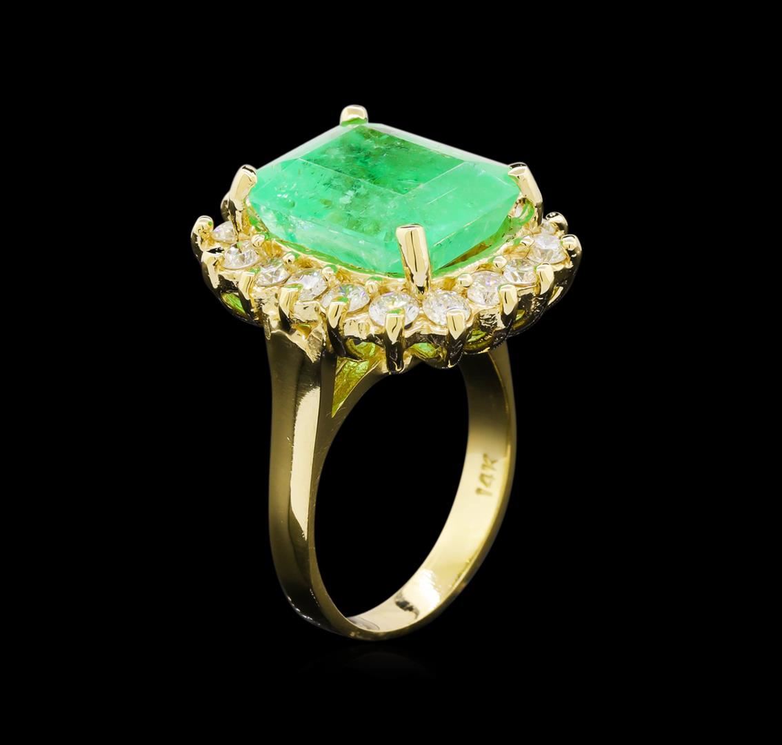 One electronically tested 14KT yellow gold lady's cast fashion ring with a basket halo with a bright polish finish. The featured lady's ring has a shank measuring 2.90 millimeters wide. Identified with markings of "14K". Condition is new, good workmanship. Containing: One prong set emerald step cut natural emerald, measuring 13.81 x 11.57 x 8.56mm, approximate weight of 9.39ct., clarity is moderately included, type III, medium, very slightly grayish, green color, (GIA G 5/3), cut is good. Transmitting light somewhat diffusely, transparent to translucent. Naturally occurring internal & external characteristics are present. Clarity enhanced. Graded loose prior to setting in the GIA Laboratory, Report #2175501539.Eighteen prong set round brilliant cut diamonds, measuring 2.80 - 2.70 x 1.68mm (depth est.) approximate total weight of 18 Stones = 1.40ct. Graded in the setting. Clarity: VS-2 to SI-2. Color: H - I. Cut Good. Total Weight of Colored Stones 9.39ct. Total Weight of Diamonds 1.40ct. Total Weight of Ring 10.20gm. GAS Appraised at $21,700.00.