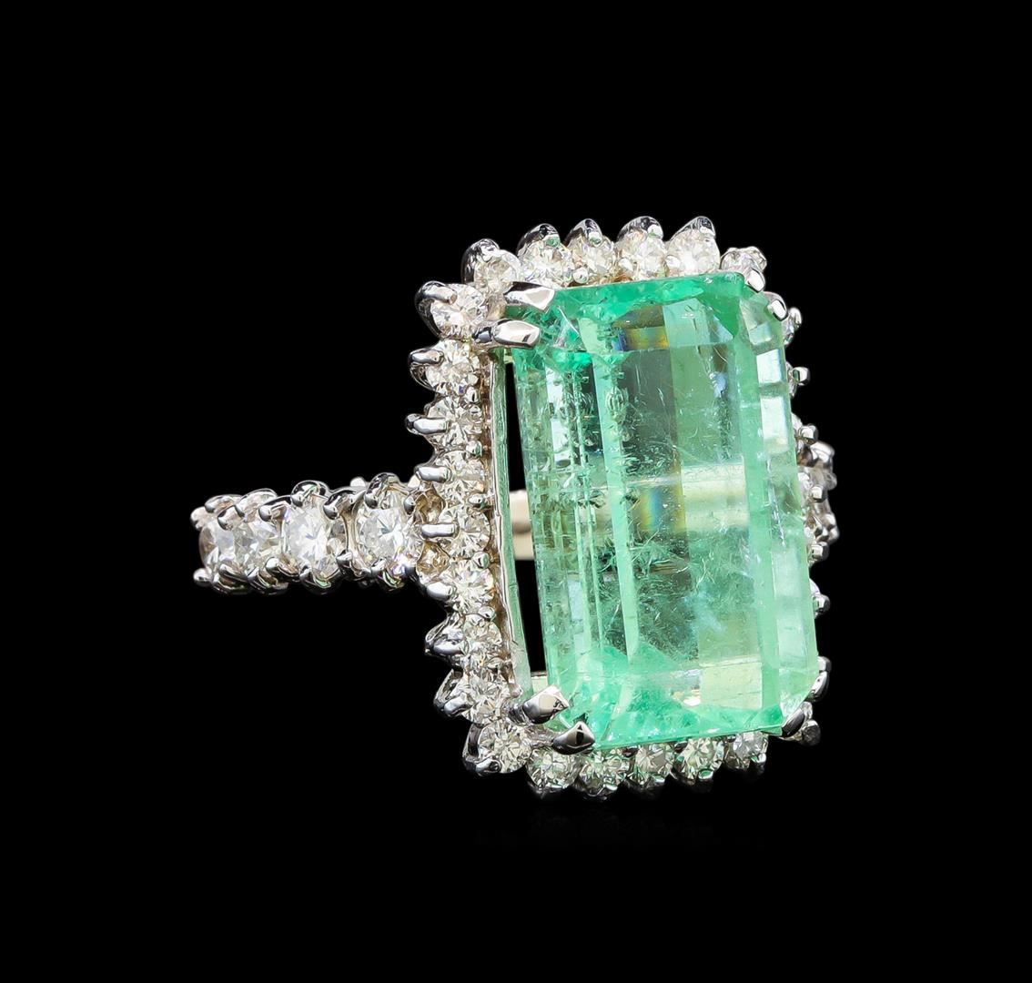 One electronically tested 14KT white gold lady's cast fashion ring with a basket halo with a bright polish finish. The featured lady's ring has a shank measuring 2.38 millimeters wide. Identified with markings of 'K14'. Condition is new, good workmanship. Containing: One prong set emerald standard step cut natural emerald, measuring 16.18 x 10.35 x 7.97mm, (depth est.) approximate weight of 9.60ct., clarity is heavily included, medium, moderately strong, green color, (GIA G 5/4), cut is very good. Transmitting light somewhat diffusely, transparent to translucent. Naturally occurring internal & external characteristics are present. Indications of oil residue. Clarity enhanced. Colored gemstones are presumed to have been subjected to commonly used enhancement processes. Graded loose prior to setting in the GIA Laboratory, Report #2175664595. Eight round brilliant cut diamonds, measuring 3.10 - 2.80 x 1.83mm (depth est.) approximate total weight of 8 Stones = 0.80ct. Graded in the setting. Twenty-Eight round brilliant cut diamonds, measuring 1.90 - 1.80 x 1.13mm (depth est.) approximate total weight of 28 Stones = 0.65ct. Graded in the setting. Total Weight of Colored Stones 9.60ct.. Total Weight of Diamonds 1.45ct.. Total Weight of Ring 8.40gm. GAS Appraised at $22,750.00.