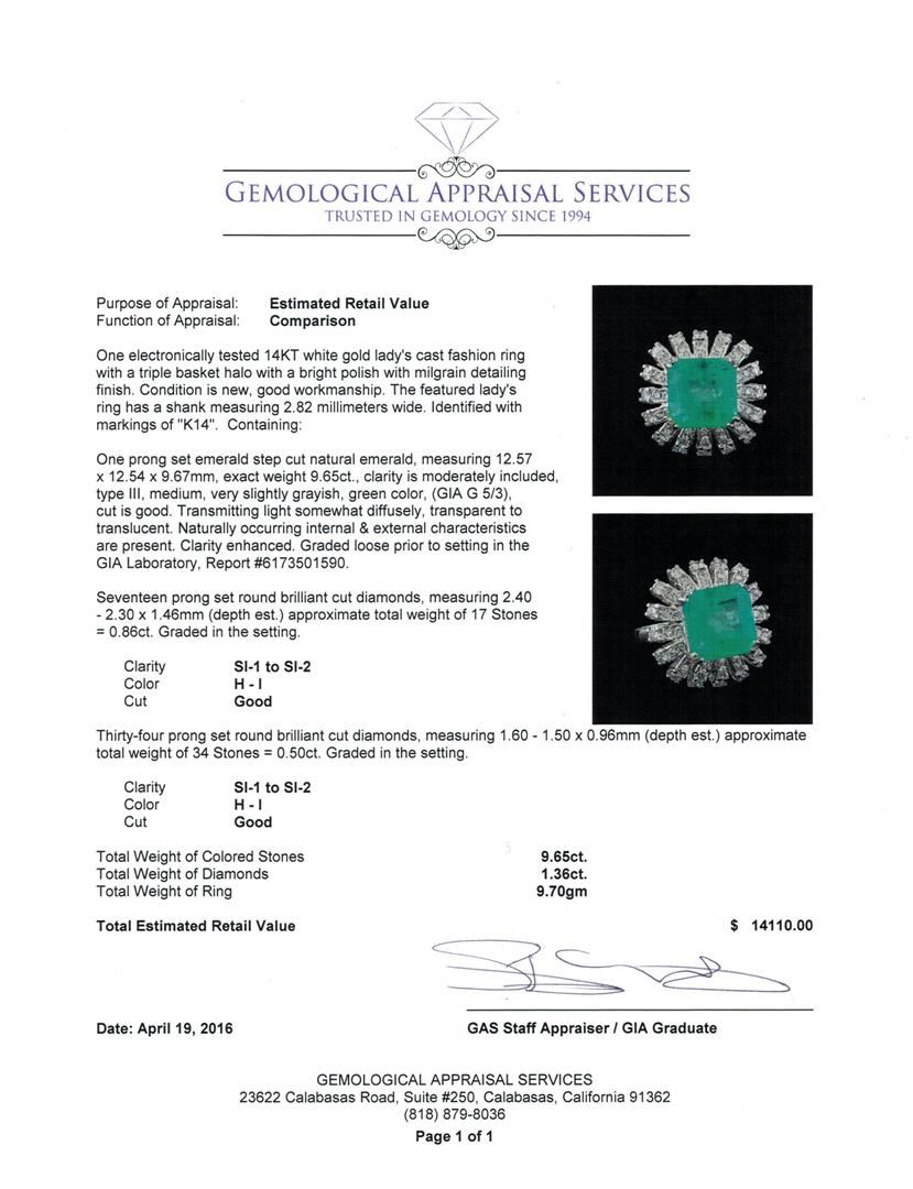 One electronically tested 14KT white gold lady's cast fashion ring with a triple basket halo with a bright polish with milgrain detailing finish. The featured lady's ring has a shank measuring 2.82 millimeters wide. Identified with markings of "K14". Condition is new, good workmanship. Containing: One prong set emerald step cut natural emerald, measuring 12.57 x 12.54 x 9.67mm, exact weight 9.65ct., clarity is moderately included, type III, medium, very slightly grayish, green color, (GIA G 5/3), cut is good. Transmitting light somewhat diffusely, transparent to translucent. Naturally occurring internal & external characteristics are present. Clarity enhanced. Graded loose prior to setting in the GIA Laboratory, Report #6173501590.Seventeen prong set round brilliant cut diamonds, measuring 2.40 - 2.30 x 1.46mm (depth est.) approximate total weight of 17 Stones = 0.86ct. Graded in the setting. Clarity: SI-1 to SI-2. Color: H - I. Cut Good Thirty-Four prong set round brilliant cut diamonds, measuring 1.60 - 1.50 x 0.96mm (depth est.) approximate total weight of 34 Stones = 0.50ct. Graded in the setting. Clarity: SI-1 to SI-2. Color: H - I. Cut Good. Total Weight of Colored Stones 9.65ct. Total Weight of Diamonds 1.36ct. Total Weight of Ring 9.70gm. GAS Appraised at $14,110.00.