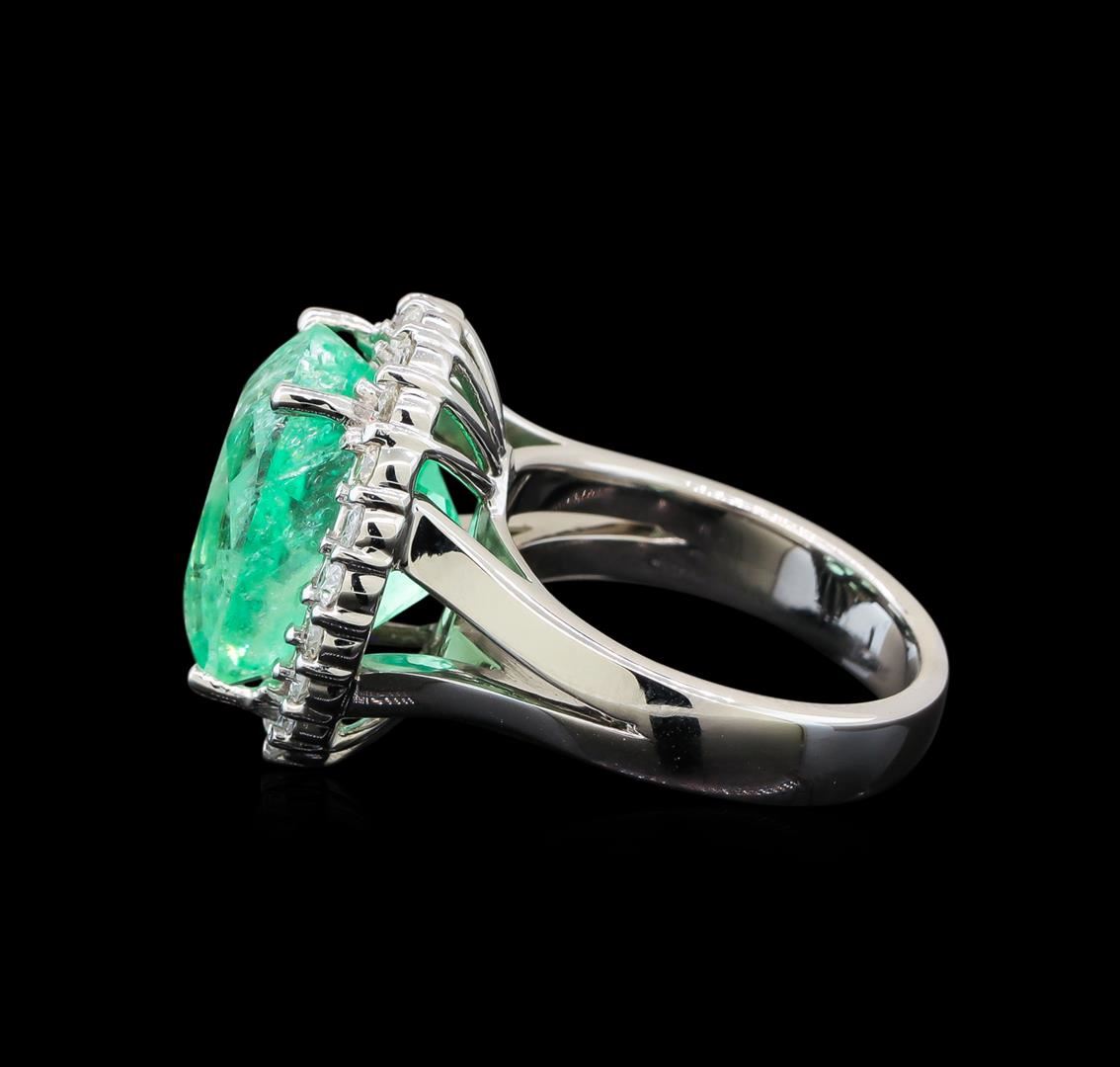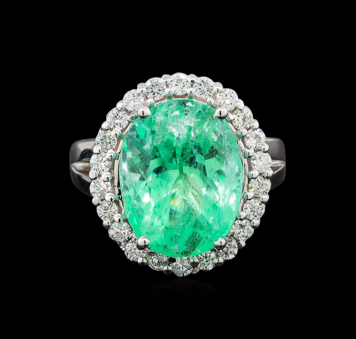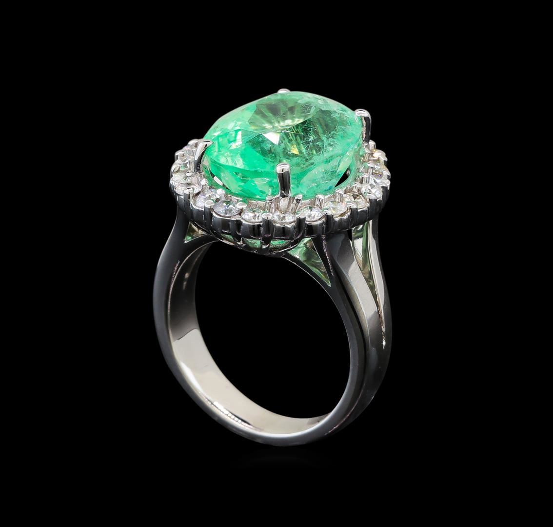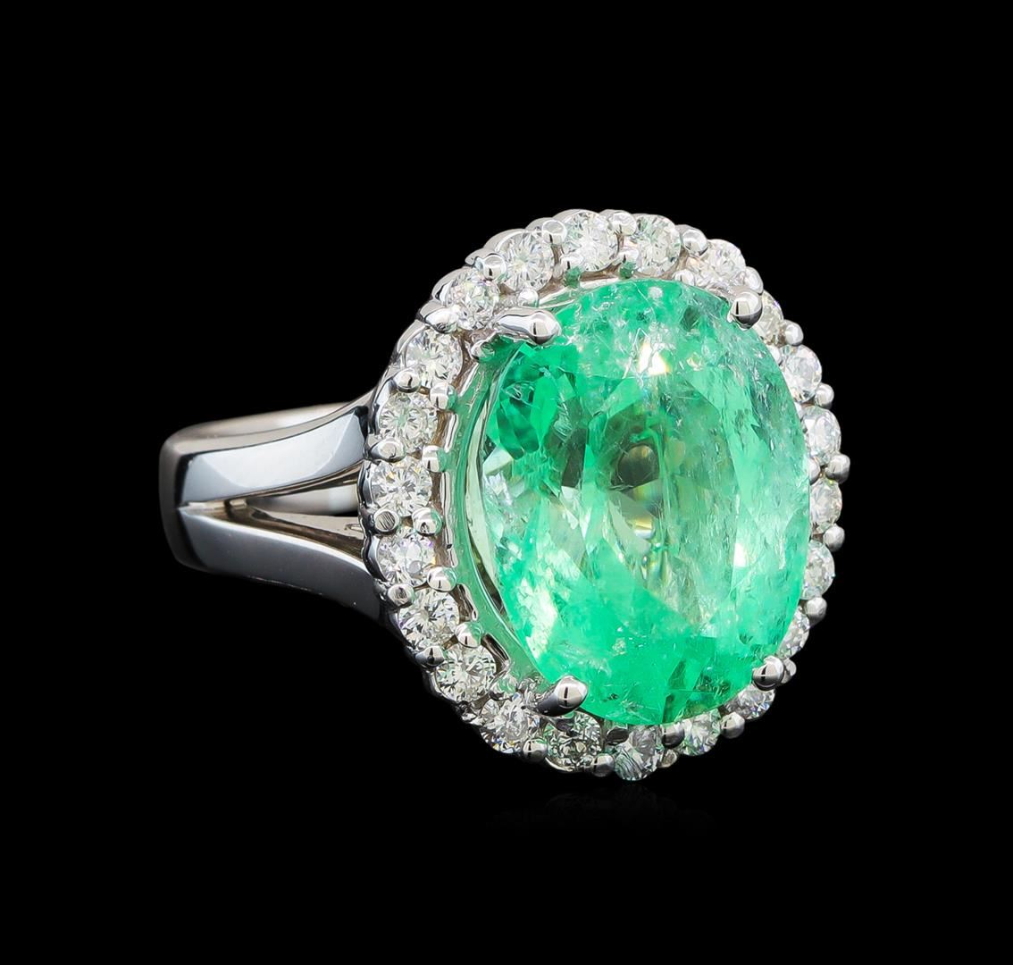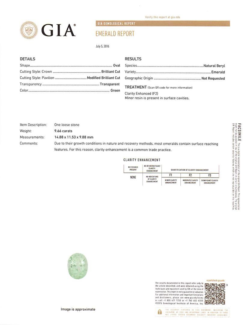 One electronically tested 14KT white gold ladies cast emerald and diamond ring with a bright polish finish. The featured emerald is set within a diamond bezel supported by a ribbed under gallery and split shoulders, completed by a four millimeter wide band. Identified with markings of '14K'. Condition is new, good workmanship. Containing: One prong set oval modified brilliant cut natural emerald, measuring 14.88 x 11.53 x 9.88mm, exact weight 9.66ct., clarity is moderately included, medium light, very slightly grayish, green color, (GIA G 4/3), cut is good. Transmitting light with a minimum of distortion, transparent. Naturally occurring internal & external characteristics are present. Moderate clarity enhancement. Minor resin is present in surface cavities. GIA Gemological Report attached. Graded loose prior to setting in the GIA Laboratory, Report #2175665032. Twenty-Two prong set round brilliant cut diamonds, measuring 2.20 - 2.00 x 1.26mm (depth est.) approximate total weight of 22 Stones = 0.78ct. Graded in the setting. Clarity SI-2 to I-2. Color: G - I. Total Weight of Colored Stones 9.66ct.. Total Weight of Diamonds 0.78ct.. Total Weight of Ring 11.77gm. AIG Appraised at $17,780.00.