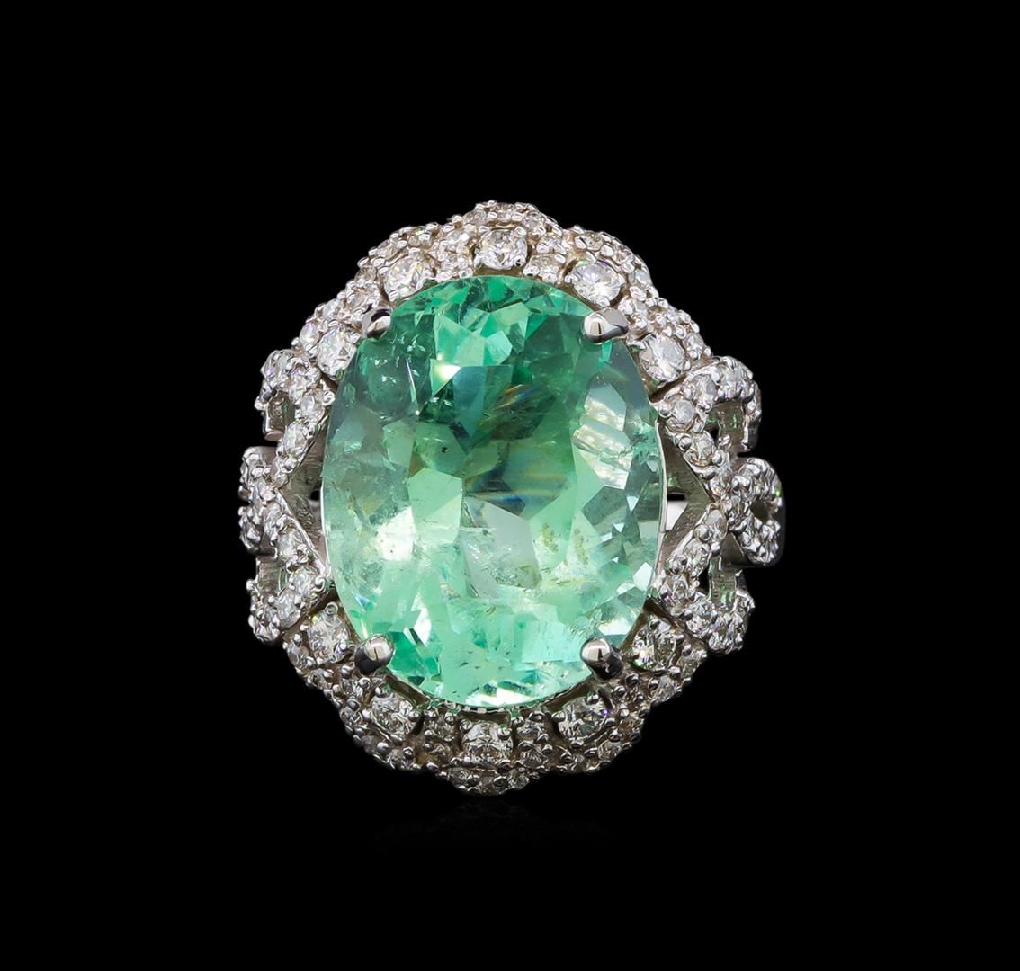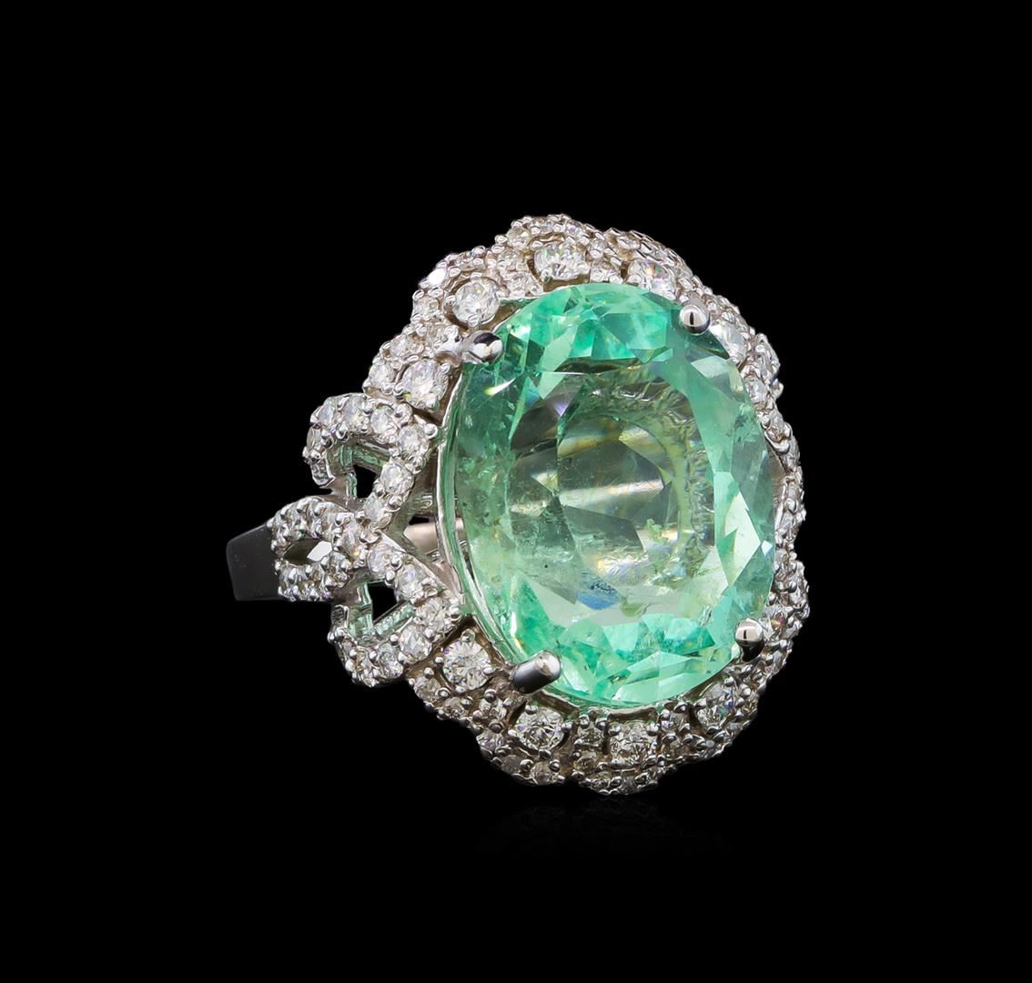 One electronically tested 14KT white gold lady's cast fashion ring with a scalloped basket halo with a bright polish finish. The featured lady's ring has a shank measuring 2.22 millimeters wide. Identified with markings of 'K14'. Condition is new, good workmanship. Containing: One prong set oval modified brilliant cut natural emerald, measuring 15.44 x 12.13 x 9.19mm, (depth est.) approximate weight of 9.68ct., clarity is slightly included, medium light, moderately strong, green color, (GIA G 4/4), cut is very good. Transmitting light with a minimum of distortion, transparent. Naturally occurring internal & external characteristics are present. Indications of oil residue. Colored gemstones are presumed to have been subjected to commonly used enhancement processes. Graded loose prior to setting in the GIA Laboratory, Report #5172665019. Ten prong set round brilliant cut diamonds, measuring 2.00 - 1.90 x 1.21mm (depth est.) approximate total weight of 10 Stones = 0.28ct. Graded in the setting. Clarity SI-1 to I-1. Color: H - I Cut Good Eighty-Four prong set round brilliant cut diamonds, measuring 1.30 - 1.20 x 0.75mm (depth est.) approximate total weight of 84 Stones = 0.60ct. Graded in the setting. Clarity SI-1 to I-1. Color: G - I Cut Good. Total Weight of Colored Stones 9.68ct.. Total Weight of Diamonds 0.88ct.. Total Weight of Ring 8.50gm. GAS Appraised at $22,230.00.
