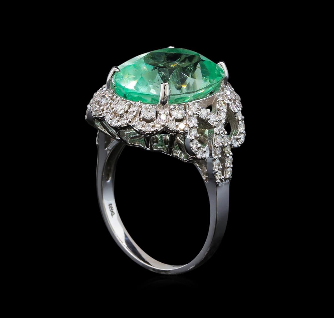 One electronically tested 14KT white gold lady's cast fashion ring with a scalloped basket halo with a bright polish finish. The featured lady's ring has a shank measuring 2.22 millimeters wide. Identified with markings of 'K14'. Condition is new, good workmanship. Containing: One prong set oval modified brilliant cut natural emerald, measuring 15.44 x 12.13 x 9.19mm, (depth est.) approximate weight of 9.68ct., clarity is slightly included, medium light, moderately strong, green color, (GIA G 4/4), cut is very good. Transmitting light with a minimum of distortion, transparent. Naturally occurring internal & external characteristics are present. Indications of oil residue. Colored gemstones are presumed to have been subjected to commonly used enhancement processes. Graded loose prior to setting in the GIA Laboratory, Report #5172665019. Ten prong set round brilliant cut diamonds, measuring 2.00 - 1.90 x 1.21mm (depth est.) approximate total weight of 10 Stones = 0.28ct. Graded in the setting. Clarity SI-1 to I-1. Color: H - I Cut Good Eighty-Four prong set round brilliant cut diamonds, measuring 1.30 - 1.20 x 0.75mm (depth est.) approximate total weight of 84 Stones = 0.60ct. Graded in the setting. Clarity SI-1 to I-1. Color: G - I Cut Good. Total Weight of Colored Stones 9.68ct.. Total Weight of Diamonds 0.88ct.. Total Weight of Ring 8.50gm. GAS Appraised at $22,230.00.