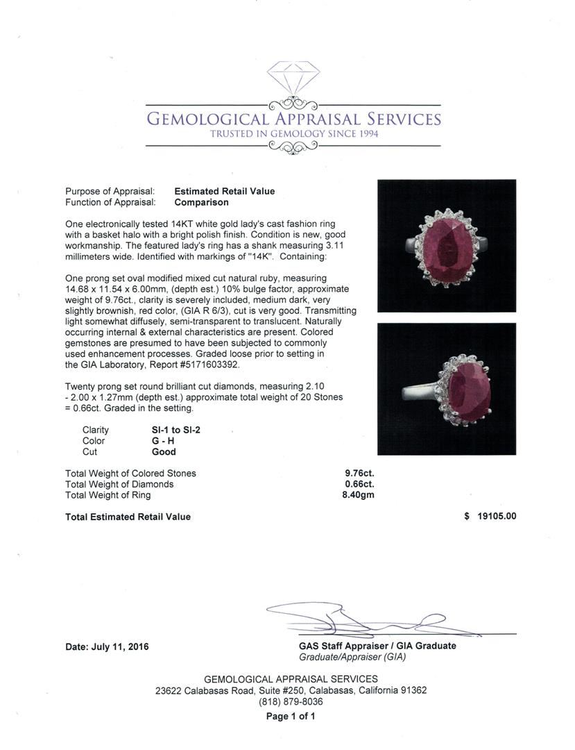 One electronically tested 14KT white gold lady's cast fashion ring with a basket halo with a bright polish finish. The featured lady's ring has a shank measuring 3.11 millimeters wide. Identified with markings of '14K'. Condition is new, good workmanship. Containing: One prong set oval modified mixed cut natural ruby, measuring 14.68 x 11.54 x 6.00mm, (depth est.) 10%. bulge factor, approximate weight of 9.76ct., clarity is severely included, medium dark, very slightly brownish, red color, (GIA R 6/3), cut is very good. Transmitting light somewhat diffusely, semi-transparent to translucent. Naturally occurring internal & external characteristics are present. Colored gemstones are presumed to have been subjected to commonly used enhancement processes. Graded loose prior to setting in the GIA Laboratory, Report #5171603392. Twenty prong set round brilliant cut diamonds, measuring 2.10 - 2.00 x 1.27mm (depth est.) approximate total weight of 20 Stones = 0.66ct. Graded in the setting. Clarity SI-1 to SI-2. Color: G - H Cut Good. Total Weight of Colored Stones 9.76ct.. Total Weight of Diamonds 0.66ct.. Total Weight of Ring 8.40gm. GAS Appraised at $19,105.00.