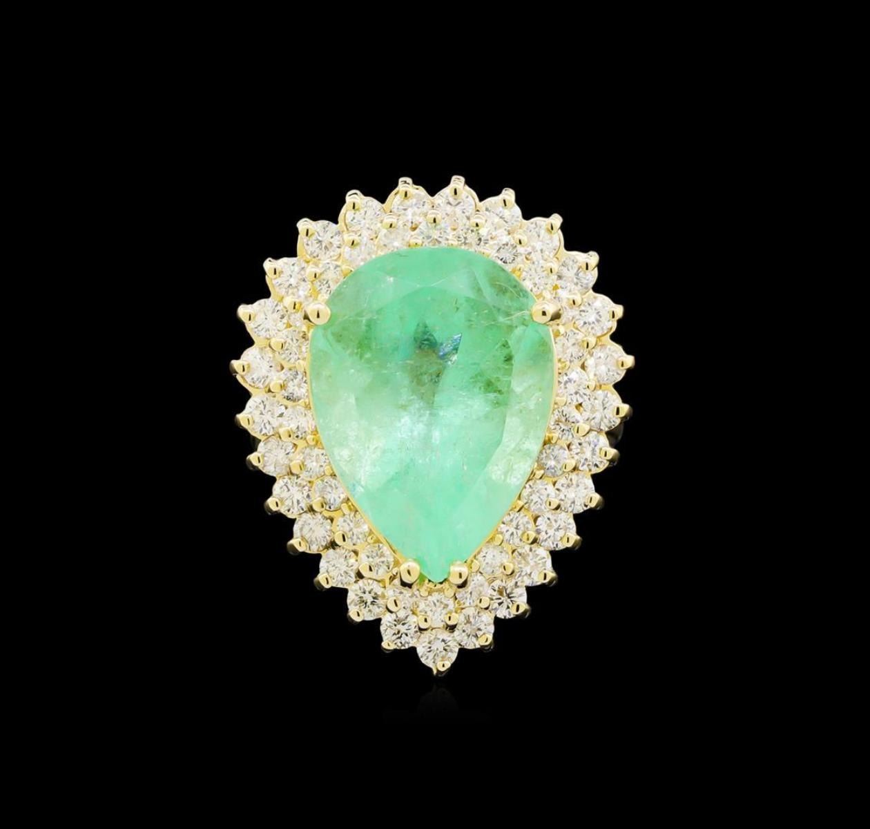 One electronically tested 14KT yellow gold lady's cast fashion ring with a double basket halo with a bright polish finish. The featured lady's ring has a shank measuring 2.81 millimeters wide. Identified with markings of "K14". Condition is new, good workmanship. Containing: One prong set pear modified brilliant cut natural emerald, measuring 17.53 x 12.81 x 8.94mm, exact weight 9.78ct., clarity is moderately included, type III, medium, very slightly grayish, green color, (GIA G 5/3), cut is good. Transmitting light somewhat diffusely, transparent to translucent. Naturally occurring internal & external characteristics are present. Clarity enhanced. Graded loose prior to setting in the GIA Laboratory, Report # 2175501595.Twenty-Seven prong set round brilliant cut diamonds, measuring 2.20 - 2.10 x 1.33mm (depth est.) approximate total weight of 27 Stones = 1.03ct. Graded in the setting. Clarity: VS-2 to SI-2. Color: H - I. Cut Good Twenty-Six prong set round brilliant cut diamonds, measuring 1.90 - 1.80 x 1.11mm (depth est.) approximate total weight of 26 Stones = 0.60ct. Graded in the setting. Clarity: VS-2 to SI-2. Color: H - I. Cut Good. Total Weight of Colored Stones 9.78ct. Total Weight of Diamonds 1.63ct. Total Weight of Ring 10.90gm. GAS Appraised.