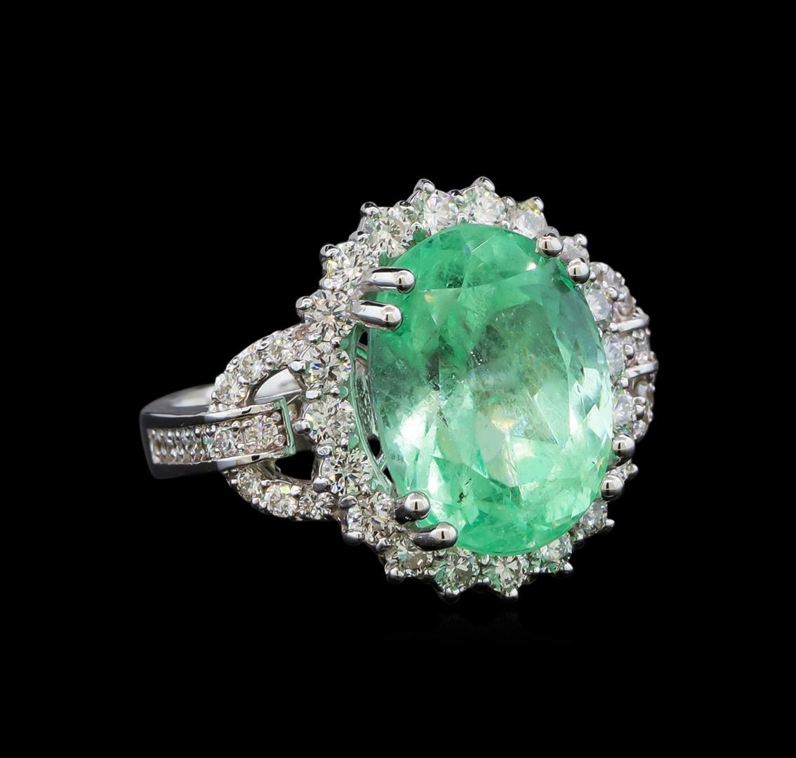 One electronically tested 14KT white gold lady's cast fashion ring with a basket halo with a bright polish finish. The featured lady's ring has a shank measuring 3.64 millimeters wide. Identified with markings of 'K14'. Condition is new, good workmanship. Containing: One prong set oval modified brilliant cut natural emerald, measuring 14.79 x 11.15 x 10.23mm, (depth est.) approximate weight of 9.80ct., clarity is moderately included, medium light, moderately strong, green color, (GIA G 4/4), cut is good. Transmitting light somewhat diffusely, transparent to translucent. Naturally occurring internal & external characteristics are present. Indications of oil residue. Colored gemstones are presumed to have been subjected to commonly used enhancement processes. Graded loose prior to setting in the GIA Laboratory, Report #5172665131. Twenty prong set round brilliant cut diamonds, measuring 2.30 - 2.20 x 1.40mm (depth est.) approximate total weight of 20 Stones = 0.89ct. Graded in the setting. Clarity SI-1 to I-1. Color: H - I Cut Good Twenty-Eight prong set round brilliant cut diamonds, measuring 1.60 - 1.50 x 0.96mm (depth est.) approximate total weight of 28 Stones = 0.39ct. Graded in the setting. Clarity SI-1 to I-1. Color: G Cut Good. Total Weight of Colored Stones 9.80ct.. Total Weight of Diamonds 1.28ct.. Total Weight of Ring 9.20gm. GAS Appraised at $18,390.00.