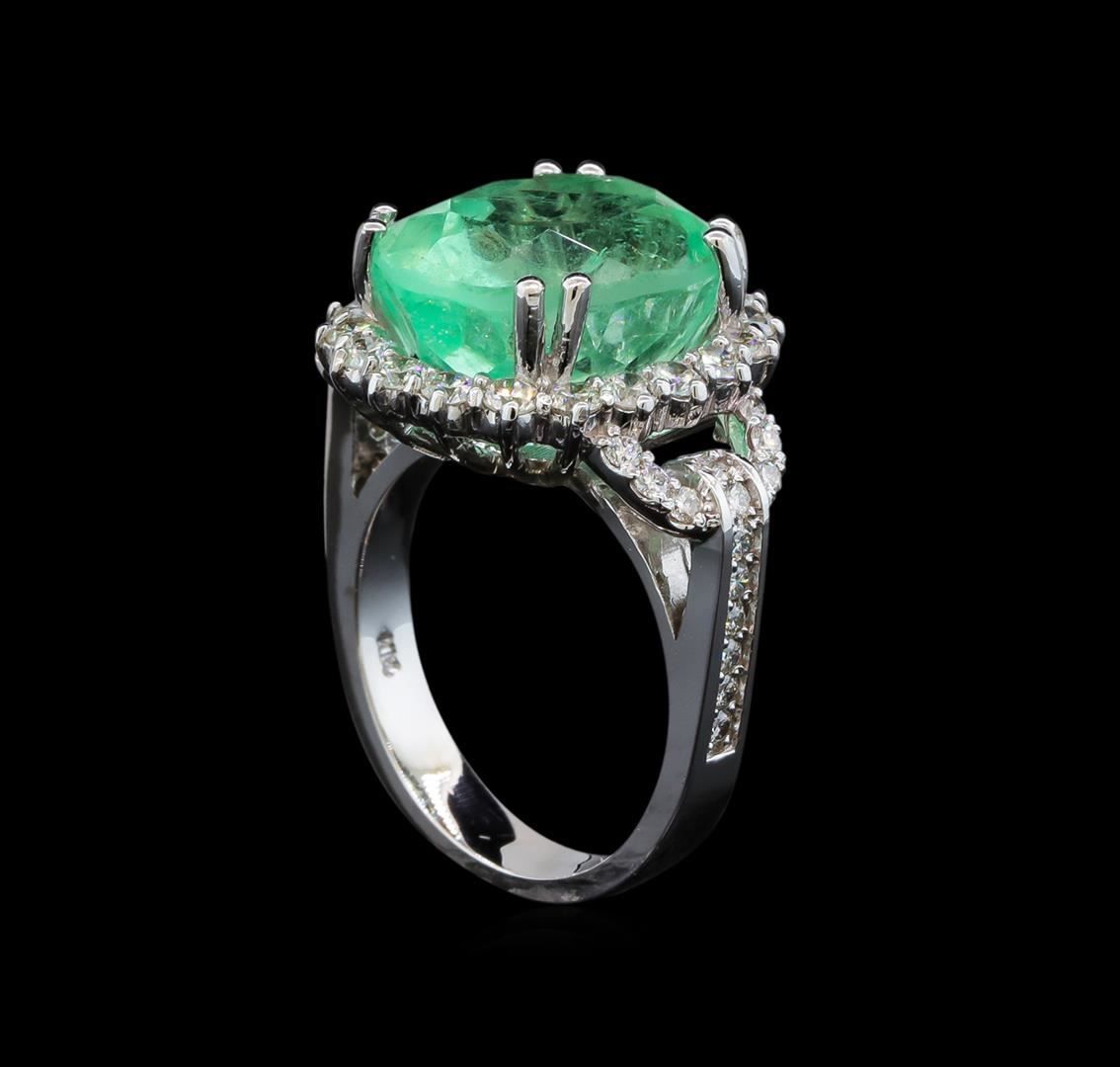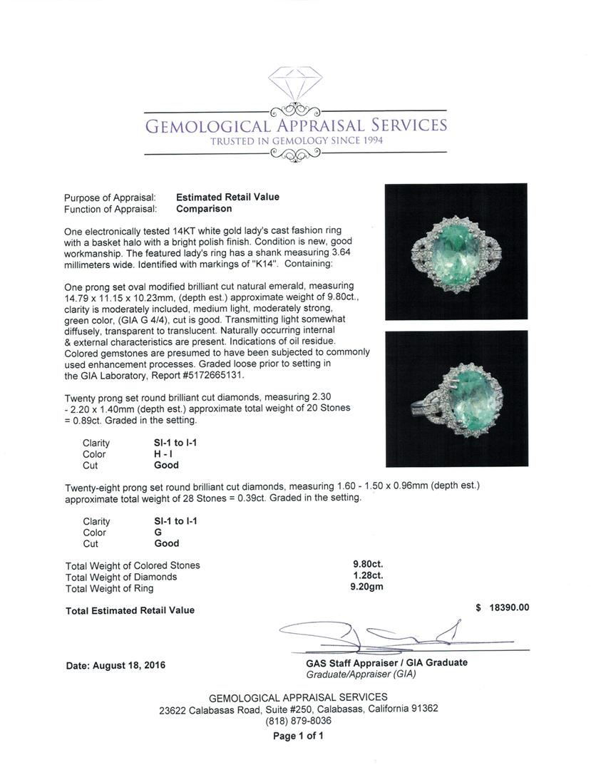 One electronically tested 14KT white gold lady's cast fashion ring with a basket halo with a bright polish finish. The featured lady's ring has a shank measuring 3.64 millimeters wide. Identified with markings of 'K14'. Condition is new, good workmanship. Containing: One prong set oval modified brilliant cut natural emerald, measuring 14.79 x 11.15 x 10.23mm, (depth est.) approximate weight of 9.80ct., clarity is moderately included, medium light, moderately strong, green color, (GIA G 4/4), cut is good. Transmitting light somewhat diffusely, transparent to translucent. Naturally occurring internal & external characteristics are present. Indications of oil residue. Colored gemstones are presumed to have been subjected to commonly used enhancement processes. Graded loose prior to setting in the GIA Laboratory, Report #5172665131. Twenty prong set round brilliant cut diamonds, measuring 2.30 - 2.20 x 1.40mm (depth est.) approximate total weight of 20 Stones = 0.89ct. Graded in the setting. Clarity SI-1 to I-1. Color: H - I Cut Good Twenty-Eight prong set round brilliant cut diamonds, measuring 1.60 - 1.50 x 0.96mm (depth est.) approximate total weight of 28 Stones = 0.39ct. Graded in the setting. Clarity SI-1 to I-1. Color: G Cut Good. Total Weight of Colored Stones 9.80ct.. Total Weight of Diamonds 1.28ct.. Total Weight of Ring 9.20gm. GAS Appraised at $18,390.00.