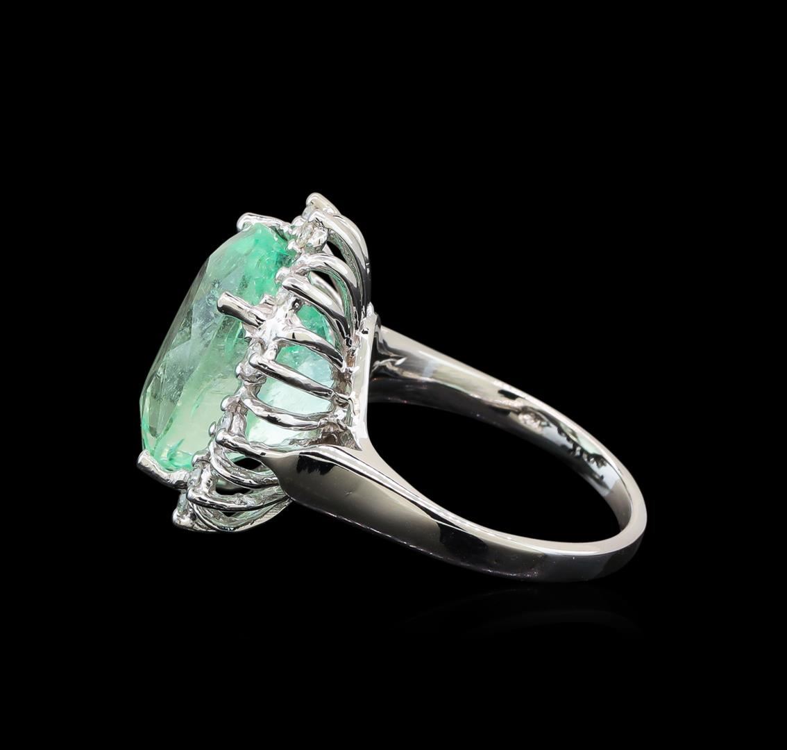 One electronically tested 14KT white gold ladies cast emerald and diamond ring with a bright polish finish. The featured emerald is set within a diamond floret supported by a ribbed under gallery, completed by a two millimeter wide band. Identified with markings of '14K'. Condition is new, good workmanship. Containing: One prong set oval modified brilliant cut natural emerald, measuring 15.29 x 11.50 x 9.62mm, exact weight 9.92ct., clarity is moderately included, type III, medium light, very slightly grayish, green color, (GIA G 4/3), cut is good. Transmitting light with a minimum of distortion, transparent. Naturally occurring internal & external characteristics are present. Moderate clarity enhancement. GIA Gemological Report attached. Graded loose prior to setting in the GIA Laboratory, Report #5172664629. Twelve prong set round brilliant cut diamonds, measuring 2.00 - 2.00 x 1.20mm (depth est.) approximate total weight of 12 Stones = 0.40ct. Graded in the setting. Clarity I-1 to I-2. Color: G - I. Total Weight of Colored Stones 9.92ct.. Total Weight of Diamonds 0.40ct.. Total Weight of Ring 8.19gm. AIG Appraised at $16,555.00.