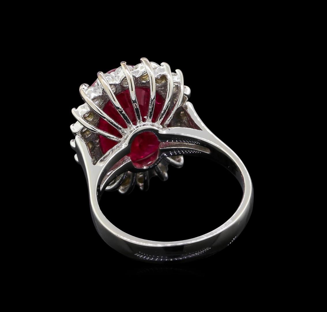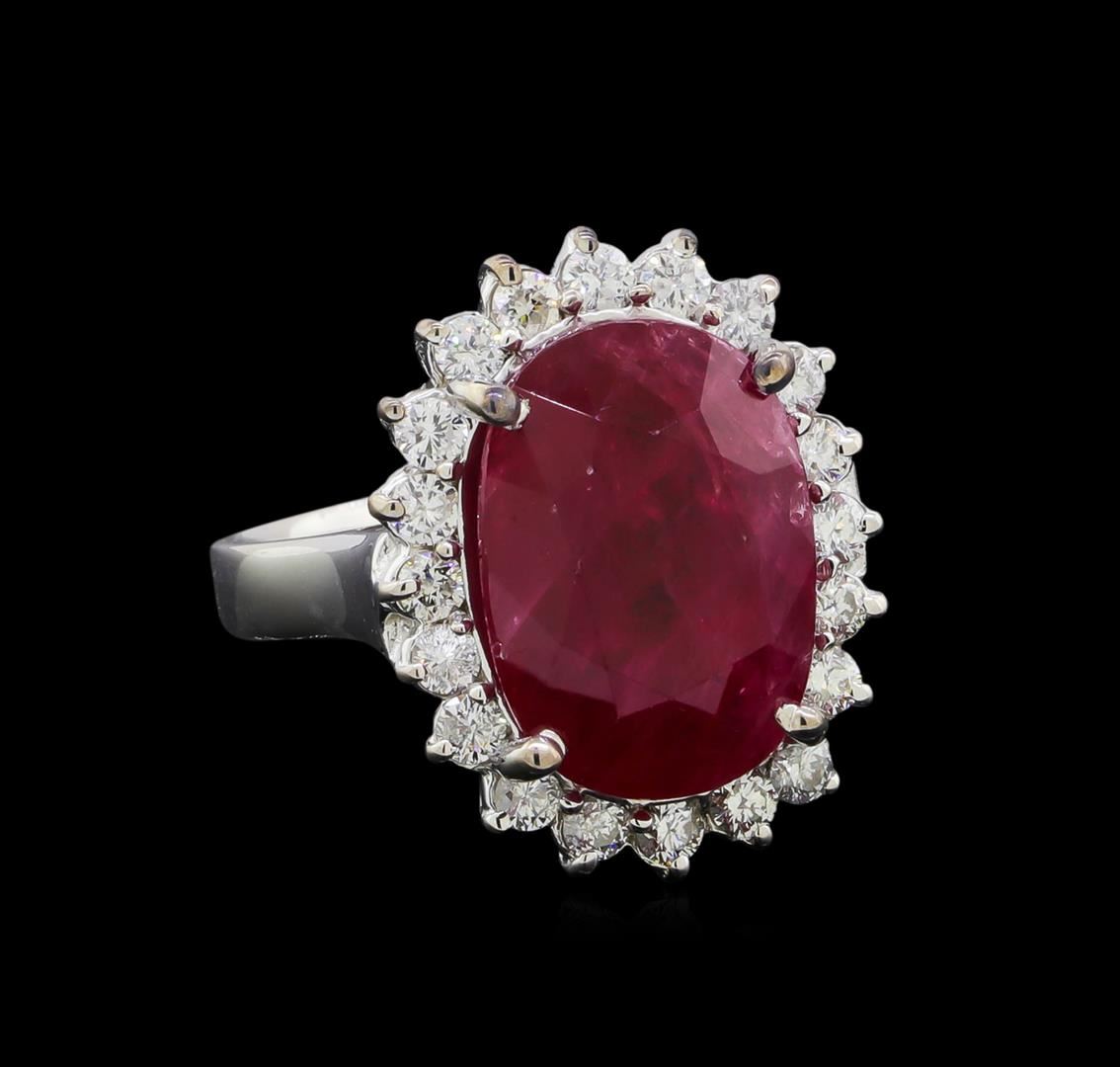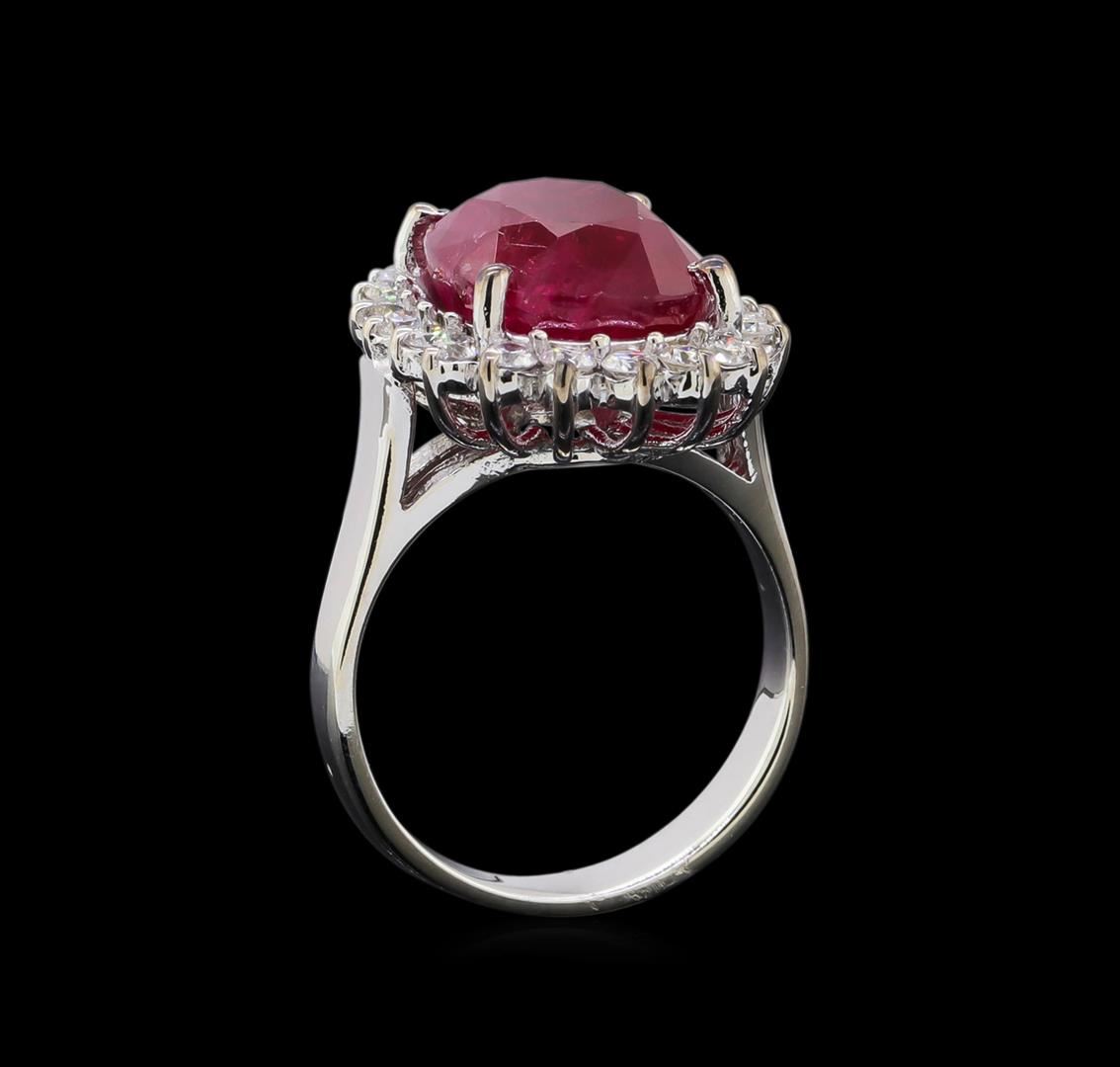 One electronically tested 14KT white gold lady's cast fashion ring with a basket halo with a bright polish finish. The featured lady's ring has a shank measuring 3.13 millimeters wide. Identified with markings of '14K'. Condition is new, good workmanship. Containing: One prong set oval modified mixed cut natural ruby, measuring 13.82 x 9.82 x 7.39mm, (depth est.) 10%. bulge factor, approximate weight of 9.95ct., clarity is severely included, medium dark, very slightly brownish, red color, (GIA R 6/3), cut is good. Transmitting light somewhat diffusely, semi-transparent to translucent. Naturally occurring internal & external characteristics are present. Colored gemstones are presumed to have been subjected to commonly used enhancement processes. Graded loose prior to setting in the GIA Laboratory, Report #2175603529. Twenty prong set round brilliant cut diamonds, measuring 2.10 - 2.05 x 1.29mm (depth est.) approximate total weight of 20 Stones = 0.68ct. Graded in the setting. Clarity SI-1 to I-1. Color: H - I Cut Good. Total Weight of Colored Stones 9.95ct.. Total Weight of Diamonds 0.68ct.. Total Weight of Ring 7.10gm. GAS Appraised at $20,455.00.