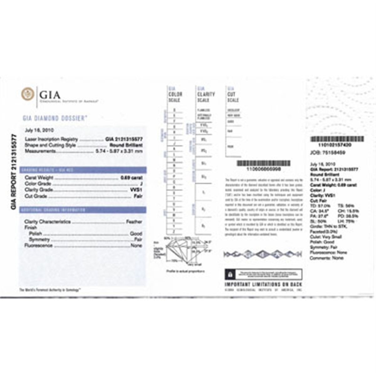 Jewelry Stone: Diamond ; Clarity: VVS1 ; Color: J ; Total CTW: 0.69 ; Dia / CTW: 0.69 ; MSRP: $14553