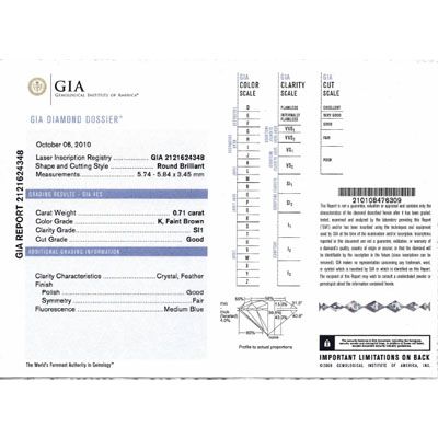 GIA Certified 0.71 ctw Round Brilliant Diamond, SI1, K **|**|** LOOSE Stone: Diamond ; Clarity: SI1 ; Color: K ; Total CTW: 0.71 ; Dia / CTW: 0.71 GIA CERTIFIED ; MSRP: $10626