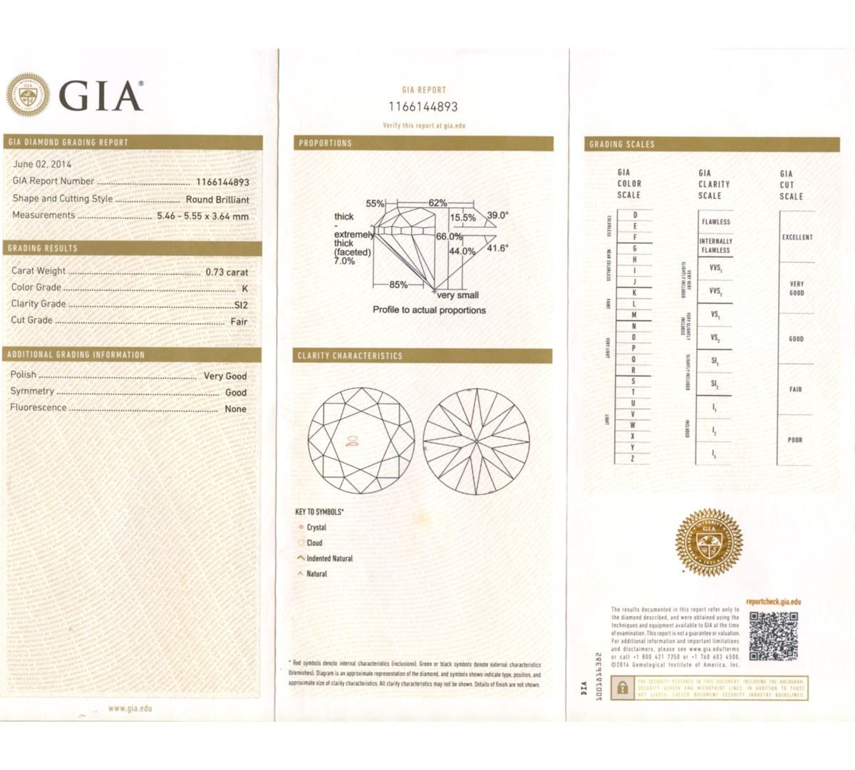 One Shape and cutting style: Round brilliant. Measurements: 5.46 x 5.55 x 3.64 mm. Carat weight: 0.73 carat. Color grade: K. Clarity grade: SI2. Cut grade: Fair. Polish: Very Good. Symmetry: Good. Fluorescence: None. GIA Report #1166144893. GIA Appraised.