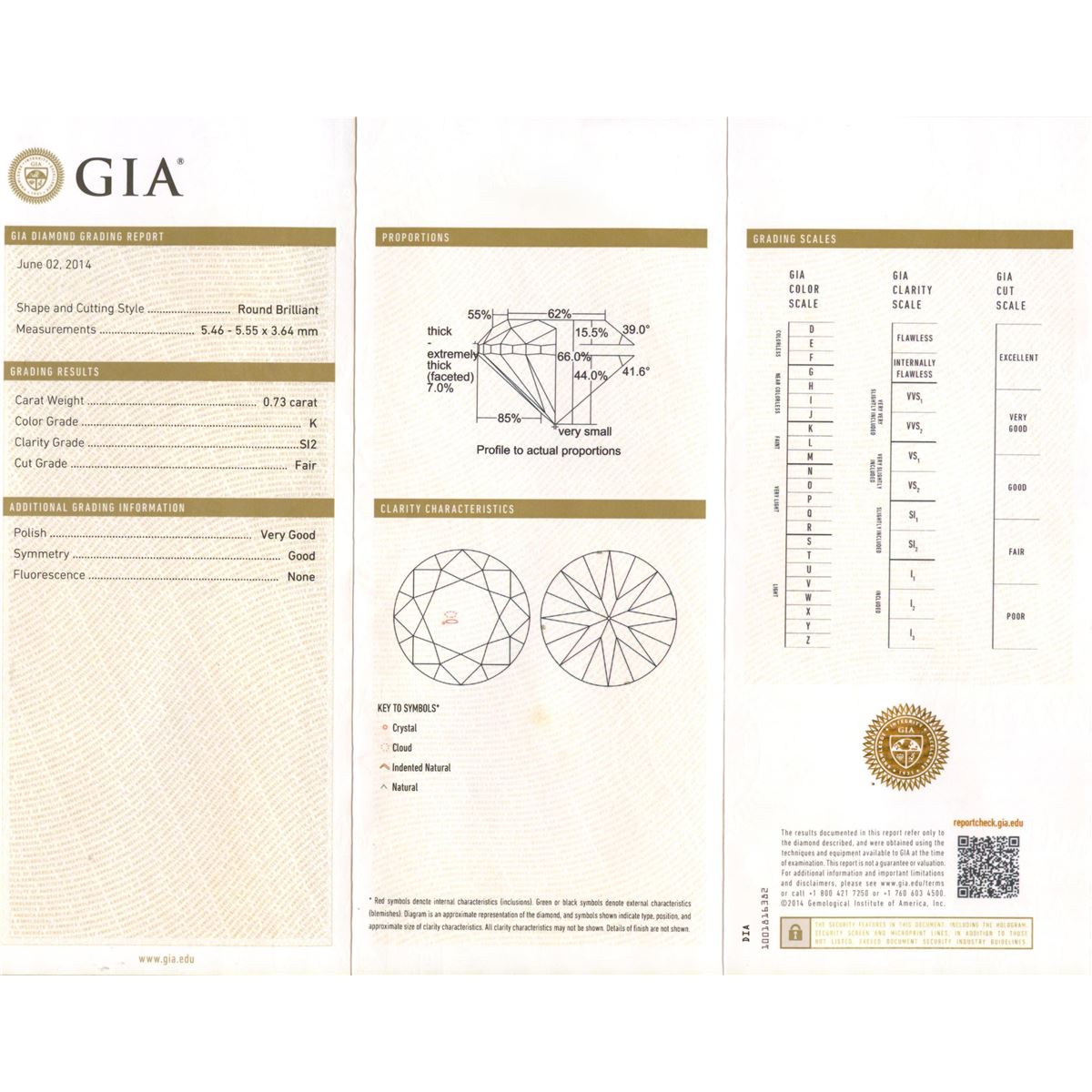 One Shape and cutting style: Round brilliant. Measurements: 5.46 x 5.55 x 3.64 mm. Carat weight: 0.73 carat. Color grade: K. Clarity grade: SI2. Cut grade: Fair. Polish: Very Good. Symmetry: Good. Fluorescence: None. GIA Report #1166144893. GIA Appraised.