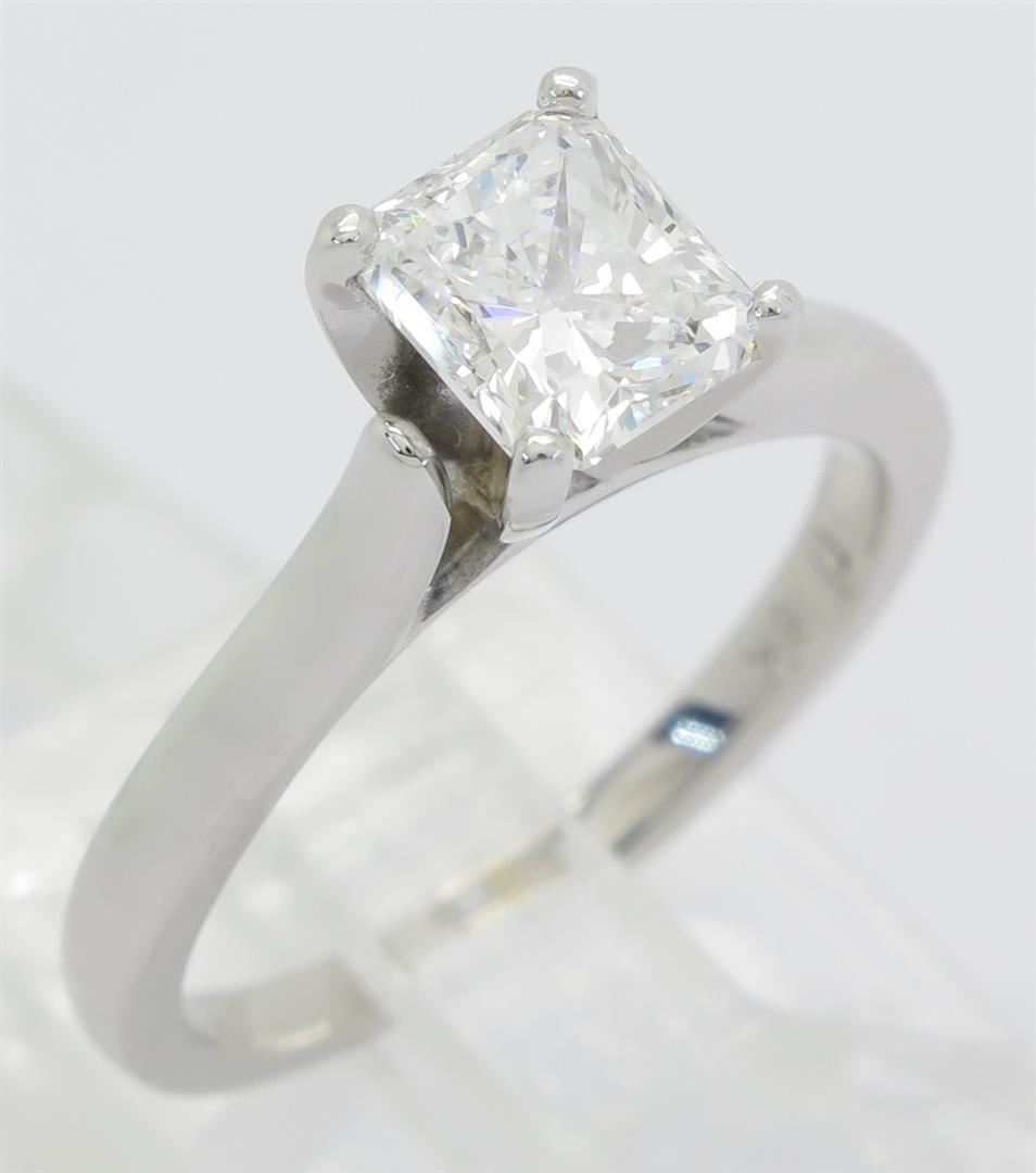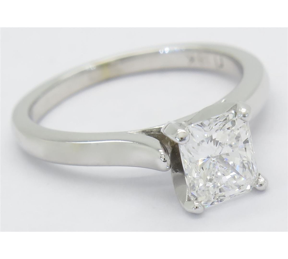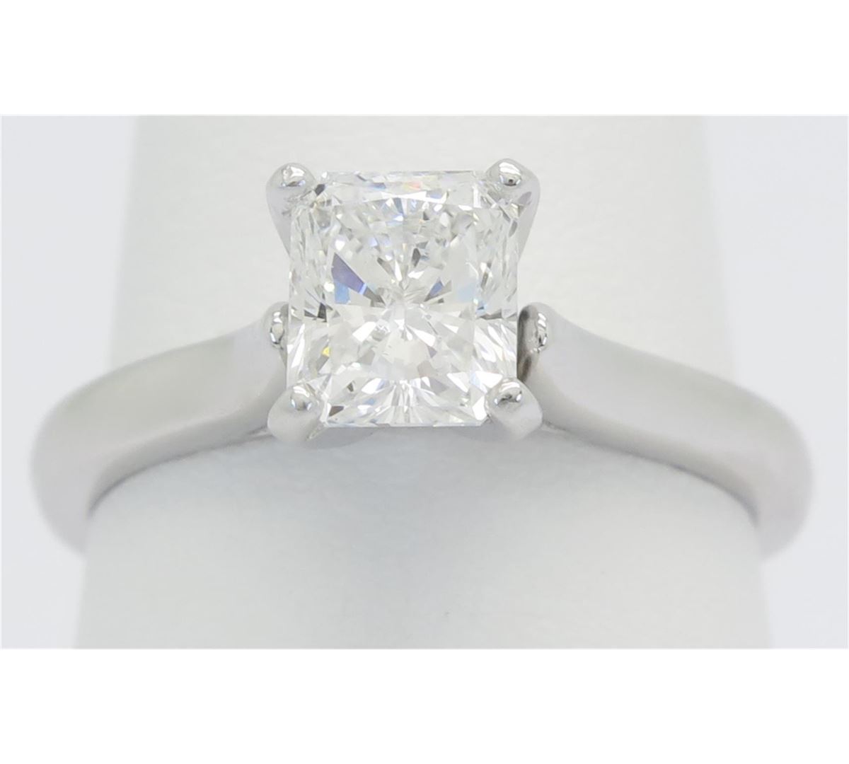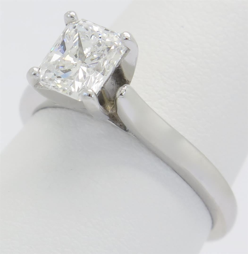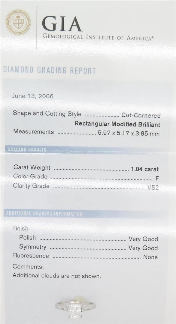 One tested 18K white gold certified diamond ring. Containing: One GIA Certified Radiant Cut Diamond. Size: 1.04CT, Clarity: VS2, Color: F. Weight of ring: 4.0 grams. Size: 5.0. GIA Appraised.