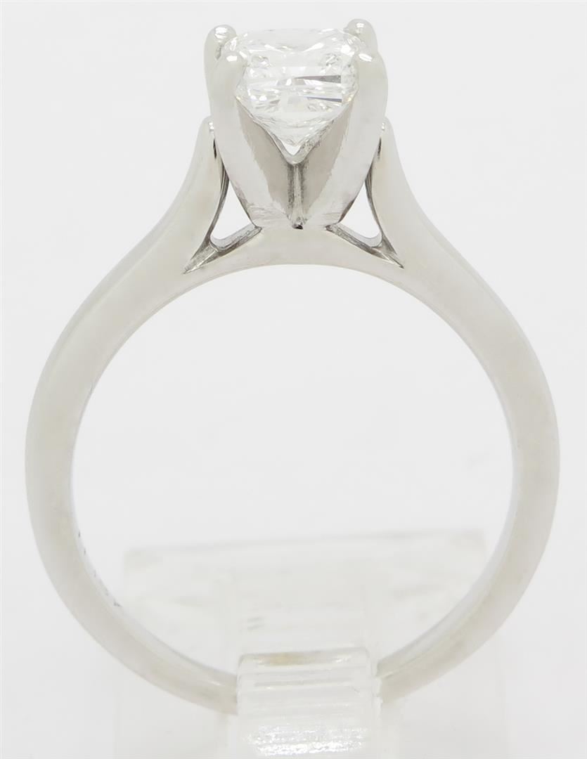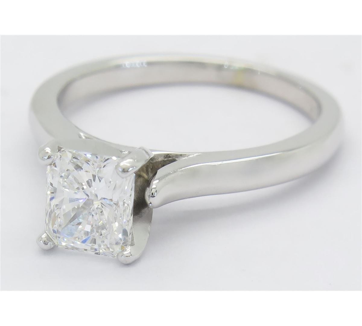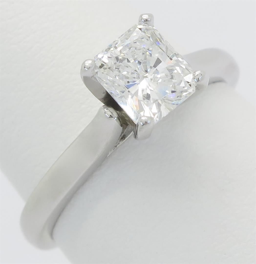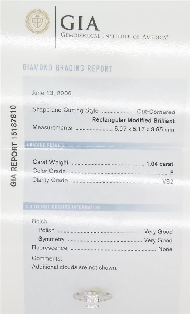 One tested 18K white gold certified diamond ring. Containing: One GIA Certified Radiant Cut Diamond. Size: 1.04CT, Clarity: VS2, Color: F. Weight of ring: 4.0 grams. Size: 5.0. GIA Appraised.