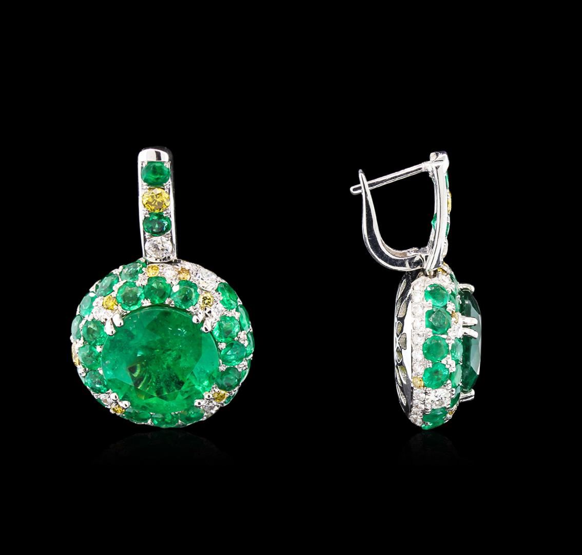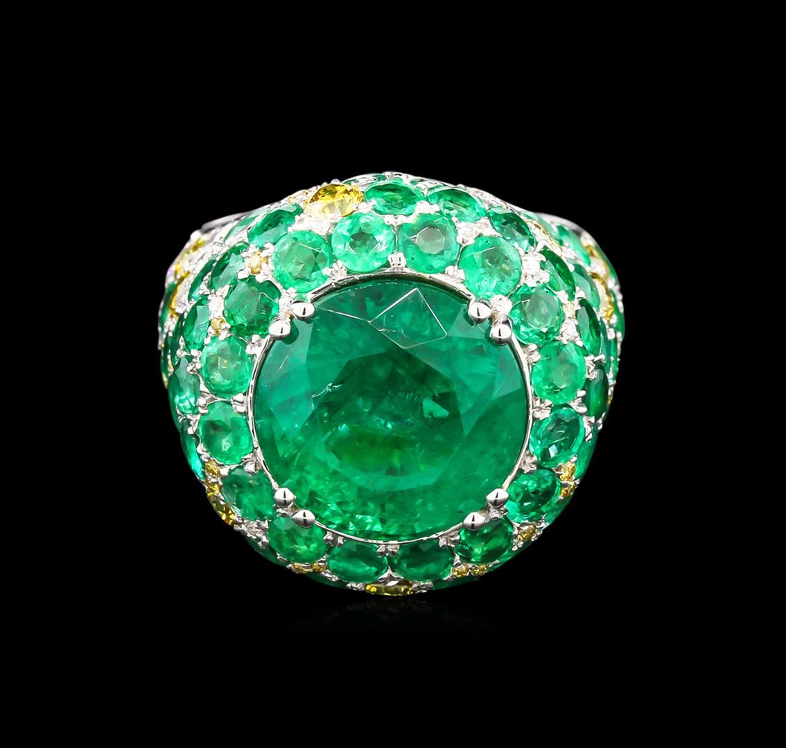One 18K white gold ring and earrings set. One 18K white gold ring, 13.39 gr. Has a center natural round cut emerald. TW:5.51cts. 0.47cts round cut diamonds. 1.30cts tw round cut yellow diamonds. One pair of earrings 18K white gold, 10.59 gr, has 2 round cut natural emerald TW: 11.96cts, 1.48cts round cut diamonds and 0.55cts round cut yellow diamonds. All fine cutting and proportions. Total Emerald Weight: 17.47cts tw. RBGS Appraised at $800,000.00.