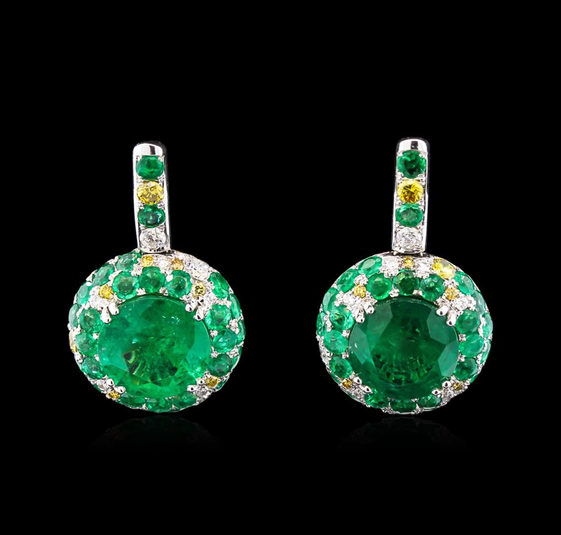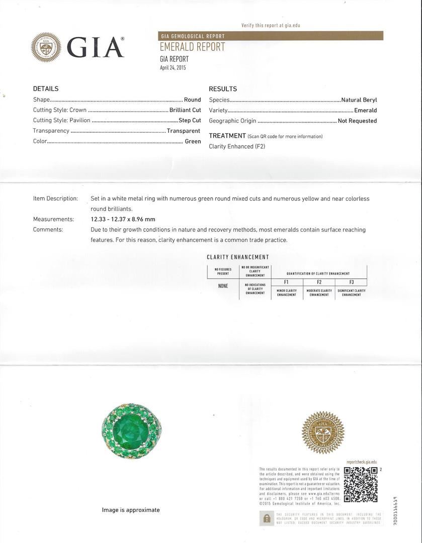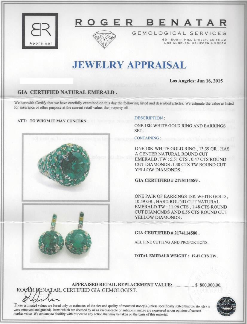 One 18K white gold ring and earrings set. One 18K white gold ring, 13.39 gr. Has a center natural round cut emerald. TW:5.51cts. 0.47cts round cut diamonds. 1.30cts tw round cut yellow diamonds. One pair of earrings 18K white gold, 10.59 gr, has 2 round cut natural emerald TW: 11.96cts, 1.48cts round cut diamonds and 0.55cts round cut yellow diamonds. All fine cutting and proportions. Total Emerald Weight: 17.47cts tw. RBGS Appraised at $800,000.00.