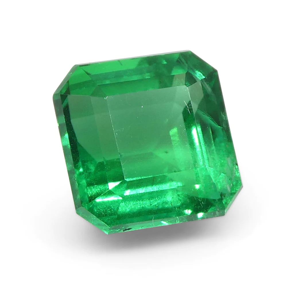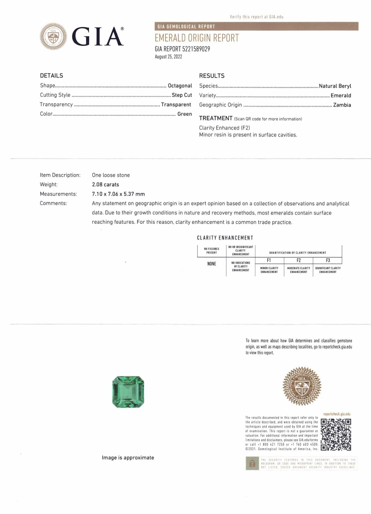 The GIA report reads as follows: GIA Report Number: 5221589029 Shape: Octagonal Cutting Style: Cutting Style: Crown: Step Cut Cutting Style: Pavilion: Transparency: Transparent Color: Green RESULTS Species: Natural Beryl Variety: Emerald Geographic Origin: Zambia Treatment: Clarity Enhanced (F2). Minor resin is present in surface cavities. Item Description: One loose stone Weight: 2.08 carats Measurements: 7.10 x 7.06 x 5.37 mm. Weight: 2.08 carats Clarity: Very Very Slightly Included: Eye Clean, no inclusions visible to the naked/unaided eye, near loupe clean, very minor inclusions visible under 10x magnification. Color: Green Hue: very slightly bluish Green Tone: 5-6 Medium-Medium Dark Saturation: 5 Strong Treatment: Clarity Enhanced (F2). Minor resin is present in surface cavities. Clarity Enhanced Colorless Oil Only *All Emeralds are Assumed to be Clarity Enhanced Origin: Zambia.