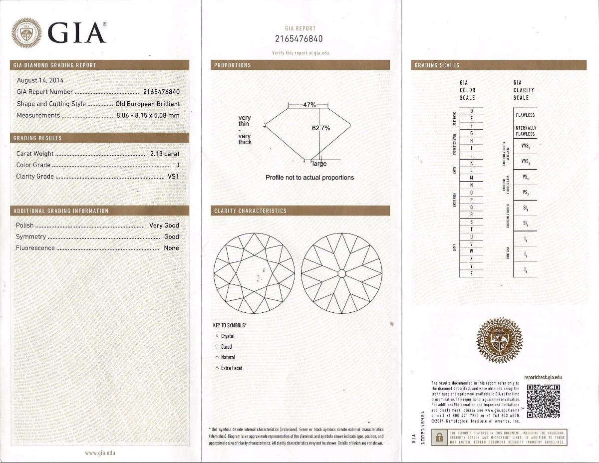 Center Diamond is GIA Certified 2.13 ct Old European Brilliant Cut Diamond. Exceptionally clear VS1 clarity and J color. No flourescence and Very Gold Polish. In a platinum mounting with two .2 ct baguette diamonds mounted on either side of center diamond, also VS clarity and I/J color. Size 6 1/4. 4.4 grams
