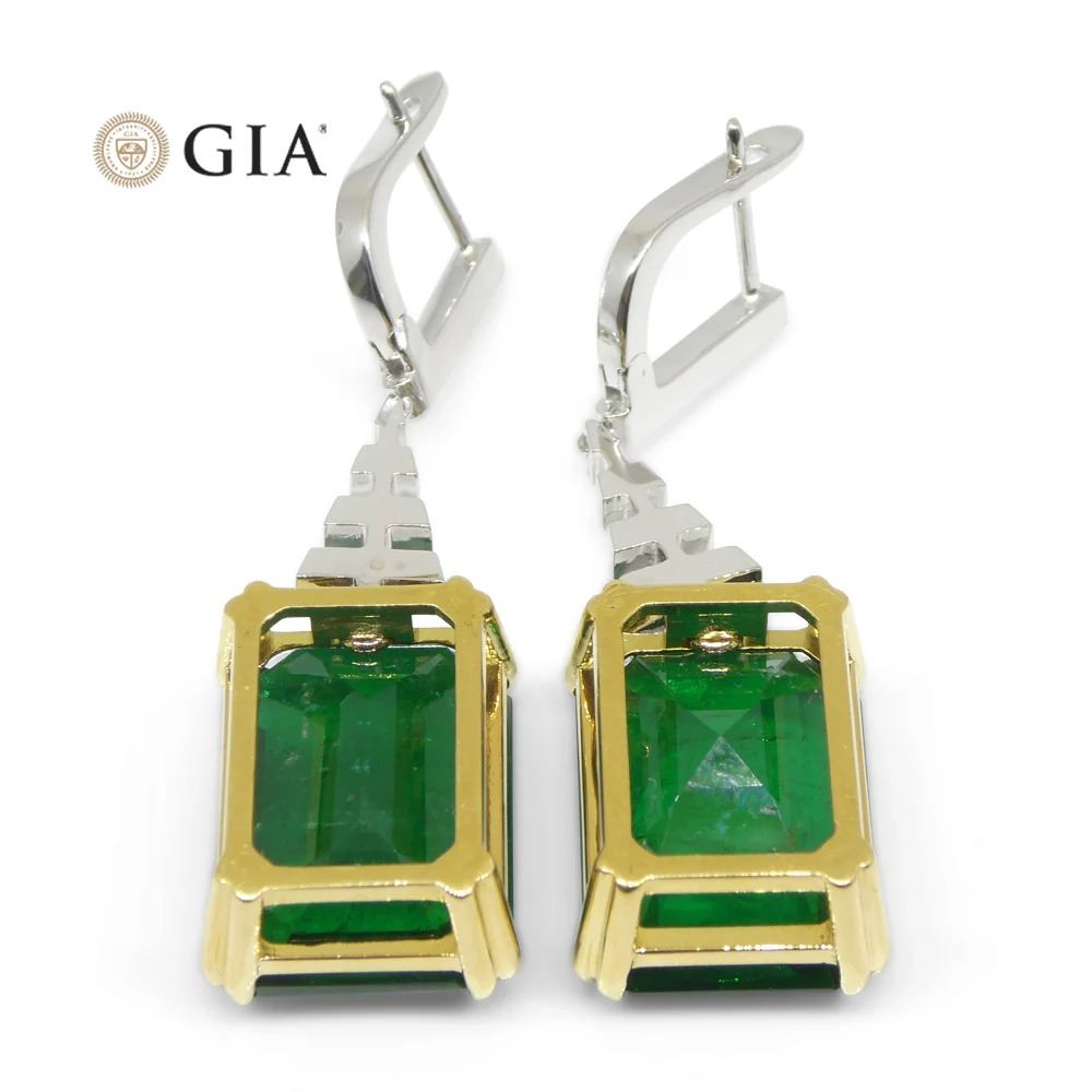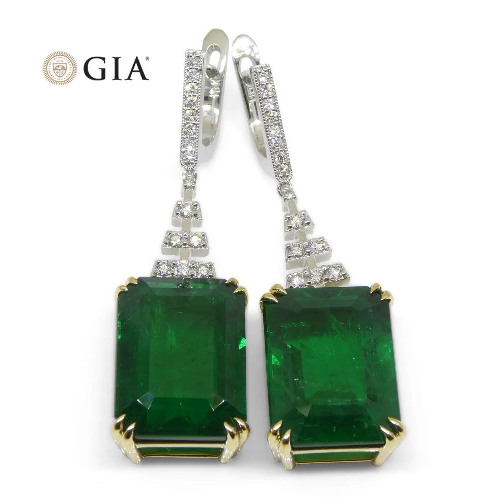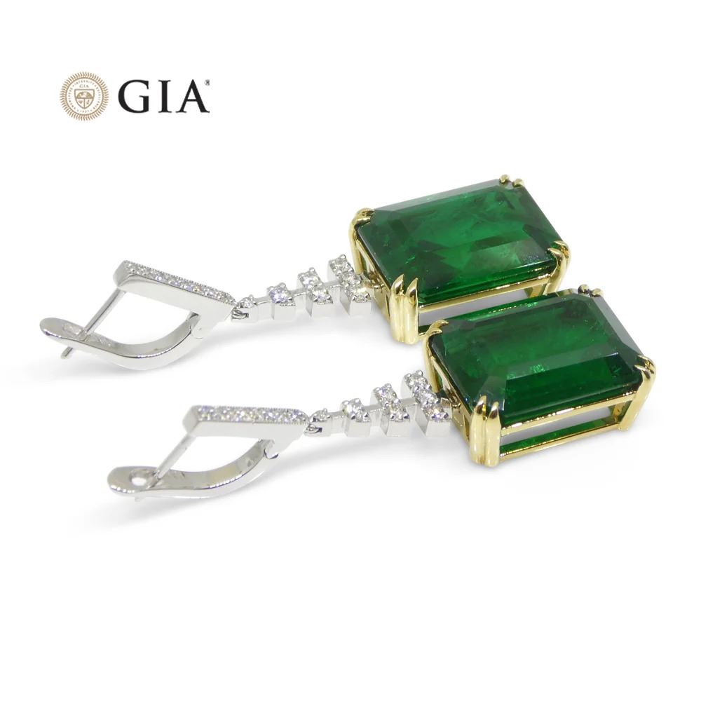 Huge Rare 23.38 Ct Green Emerald and Diamond Earrings set in 18k White and Yellow Gold. Both gemstones are an emerald cut with one weighing 11.87 Ct and measuring 16.91 x 12.34 x 6.99 mm and the other weighing 11.51 Ct and measuring 16.83 x 12.30 x 7.65 mm. Complemented with 18 Diamond accent stones. You don't want to miss this one!!! Earring length: 41 mm. Total diamond weight: 0.66 Ct. Total weight of item: 14.36g. Origin: Zambia. Please see the certification for further details.