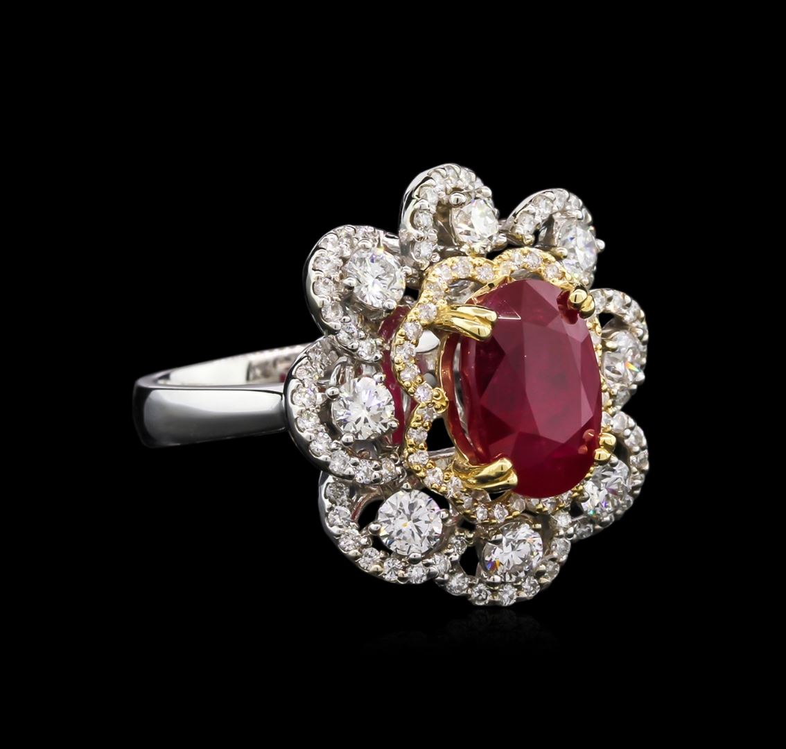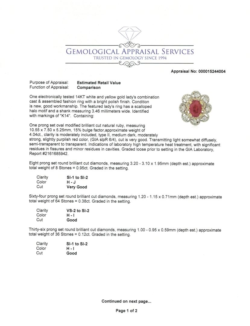 One electronically tested 14KT white and yellow gold lady's combination cast & assembled fashion ring with a bright polish finish. The featured lady's ring has a scalloped halo motif and a shank measuring 3.46 millimeters wide. Identified with markings of "K14". Condition is new, good workmanship. Containing: One prong set oval modified brilliant cut natural ruby, measuring 10.55 x 7.50 x 5.25mm, 15% bulge factor, approximate weight of 4.04ct., clarity is moderately included, type II, medium dark, moderately strong, slightly purplish red color, (GIA slpR 6/4), cut is very good. Transmitting light somewhat diffusely, semi-transparent to transparent. Indications of laboratory high temperature heat treatment, with significant residues in fissures and minor residues in cavities. Graded loose prior to setting in the GIA Laboratory, Report #2161685942.Eight prong set round brilliant cut diamonds, measuring 3.20 - 3.10 x 1.95mm (depth est.) approximate total weight of 8 Stones = 0.95ct. Graded in the setting. Clarity: SI-1 to SI-2. Color: H - J. Cut Very Good Sixty-Four prong set round brilliant cut diamonds, measuring 1.20 - 1.15 x 0.71mm (depth est.) approximate total weight of 64 Stones = 0.38ct. Graded in the setting. Clarity: VS-2 to SI-2. Color: H - I. Cut Good Thirty-Six prong set round brilliant cut diamonds, measuring 1.00 - 0.95 x 0.59mm (depth est.) approximate total weight of 36 Stones = 0.12ct. Graded in the setting. Clarity: SI-1 to SI-2. Color: H - I. Cut Good. Total Weight of Colored Stones 4.04ct. Total Weight of Diamonds 1.45ct. Total Weight of Ring 8.60gm. GAS Appraised at $16,295.00.